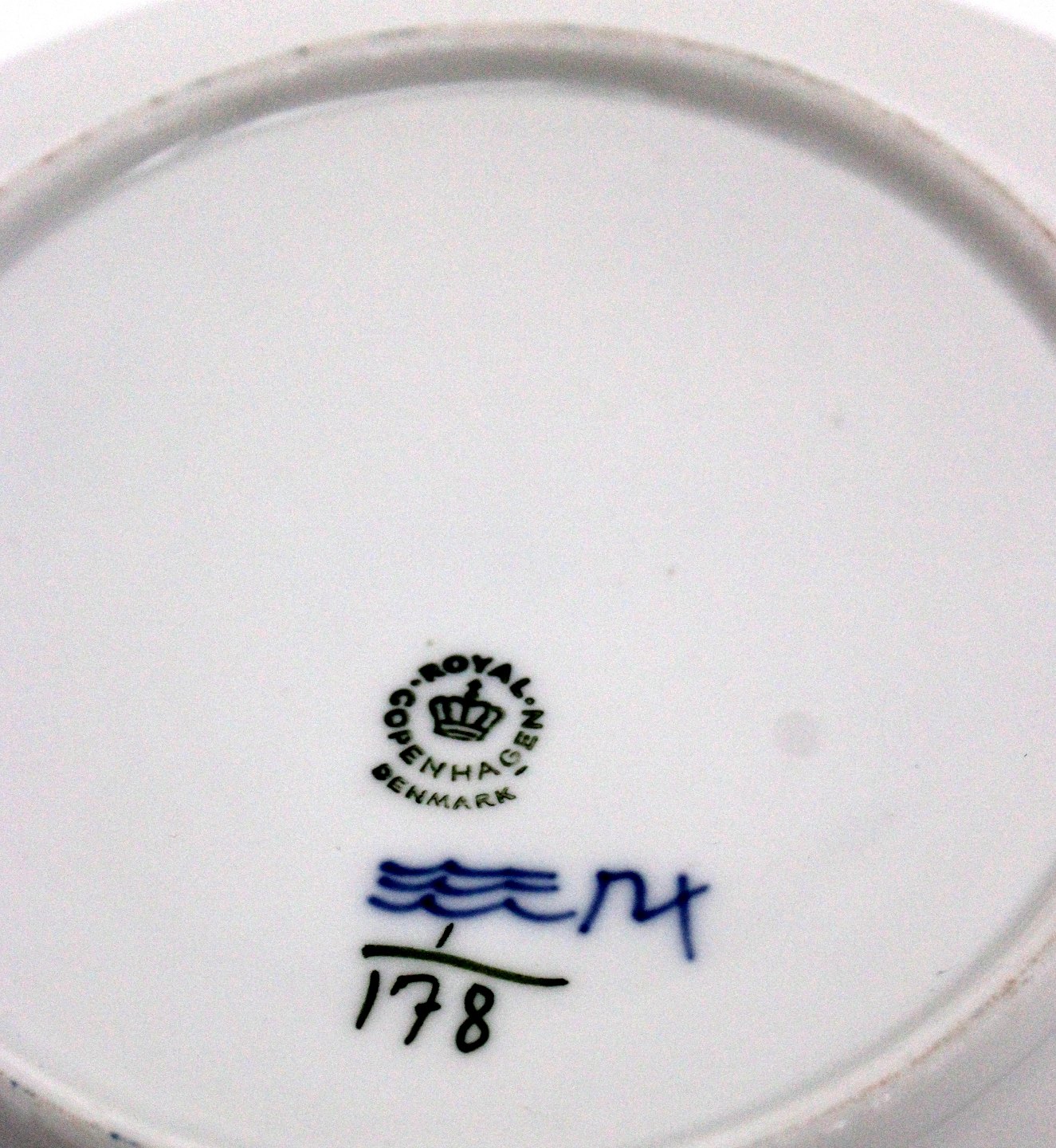 Beskrivelse: Royal Copenhagen, Musselmalet frokosttallerken. Nr. 1/178. Diameter 21 cm. I. sortering, men med brun brændingsplet se ekstrafoto med hvid baggrund. Foto med sort baggrund er modelfoto. Pris: 375 kr. stk. Lager: 1