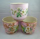 Beskrivelse: Urtepotteskjulere i en fine lyserøde nuancer med blomstermotiver. Potten øverst i foto samt urtepotten med de mørkere blomster har begge enkelte hårfine krakeleringer ved pottens øverste kant. Øverste pottes højde: 17 cm. Ø: 18 cm. Pris: 350 kr. Potte med mørkere blomster: Højde: 17 cm. Ø: 18 cm. Pris: 350 kr. Potte med lyse blomster: Højde: 17 cm. Ø: 18,5 cm. Pris: 550 kr. Varenr.: 206599