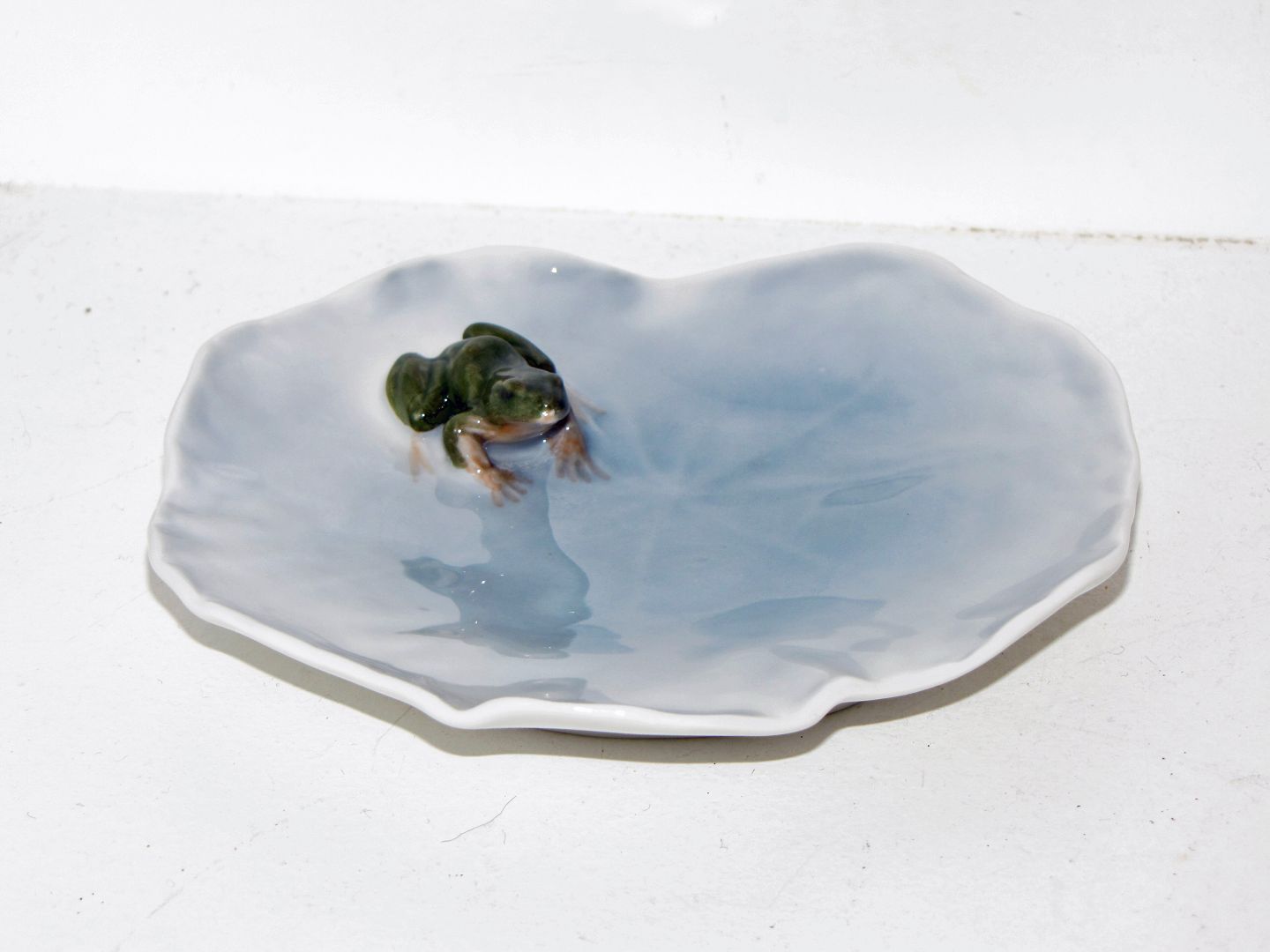 Beskrivelse: Royal Copenhagen lille skål i form af åkande med figur af grøn frø.
