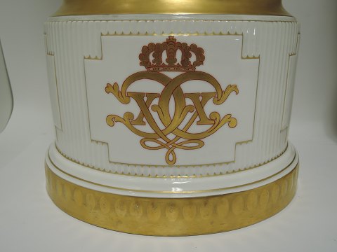 Beskrivelse: Bing & Grøndahl. Et par Prydvaser. Med kongeligt monogram med Christian X & 1914. Dekorerede med aubergine og guld med blomster buketter. Højde 62 cm