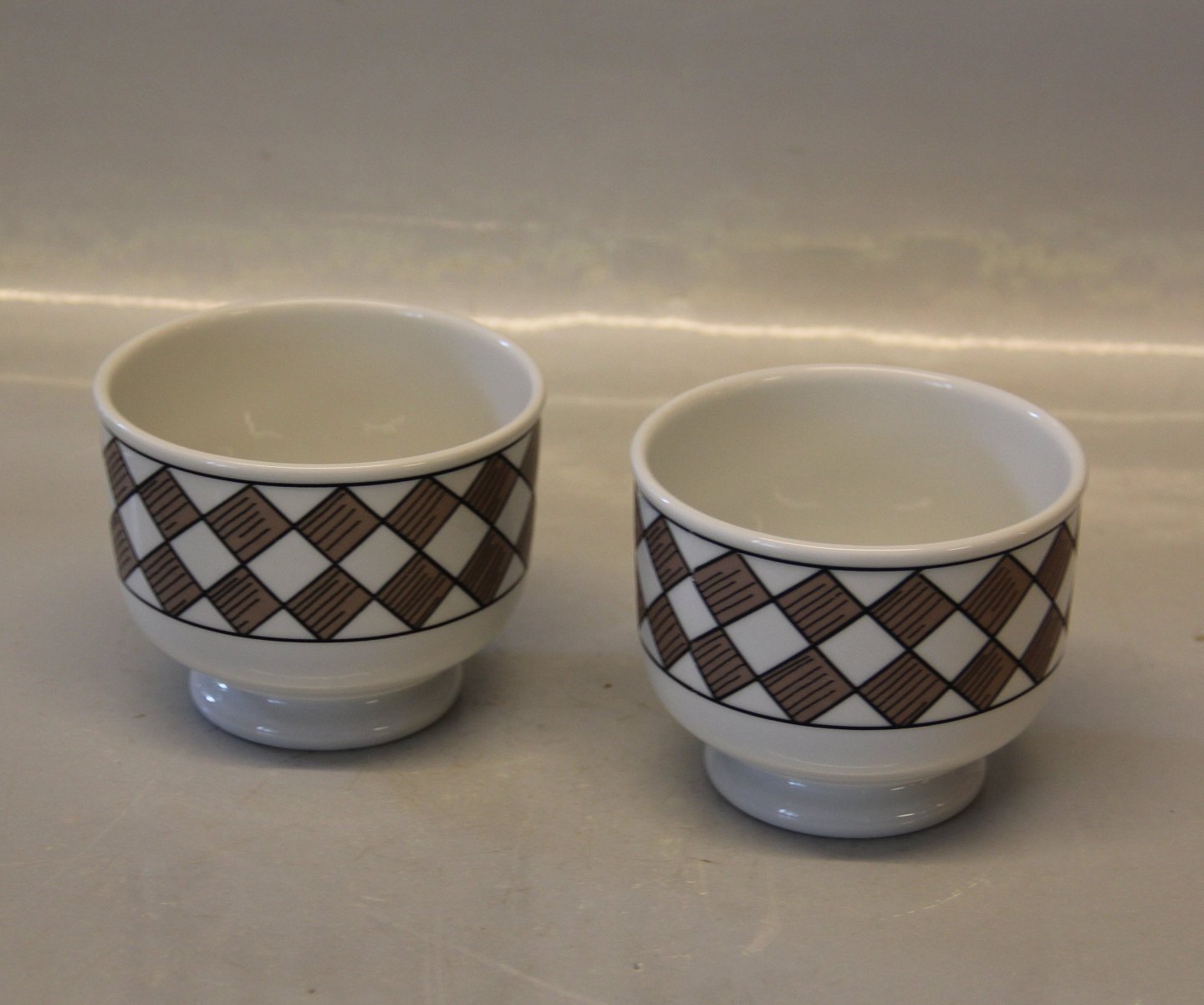 Description: B&G 570.2 Pair of Bowls 7.5 x 9.5 cm Brown squarres - harlequin Bing and Grondahl Marked with the three Royal Towers of Copenhagen. Bing & Groendahl In mint and nice condition