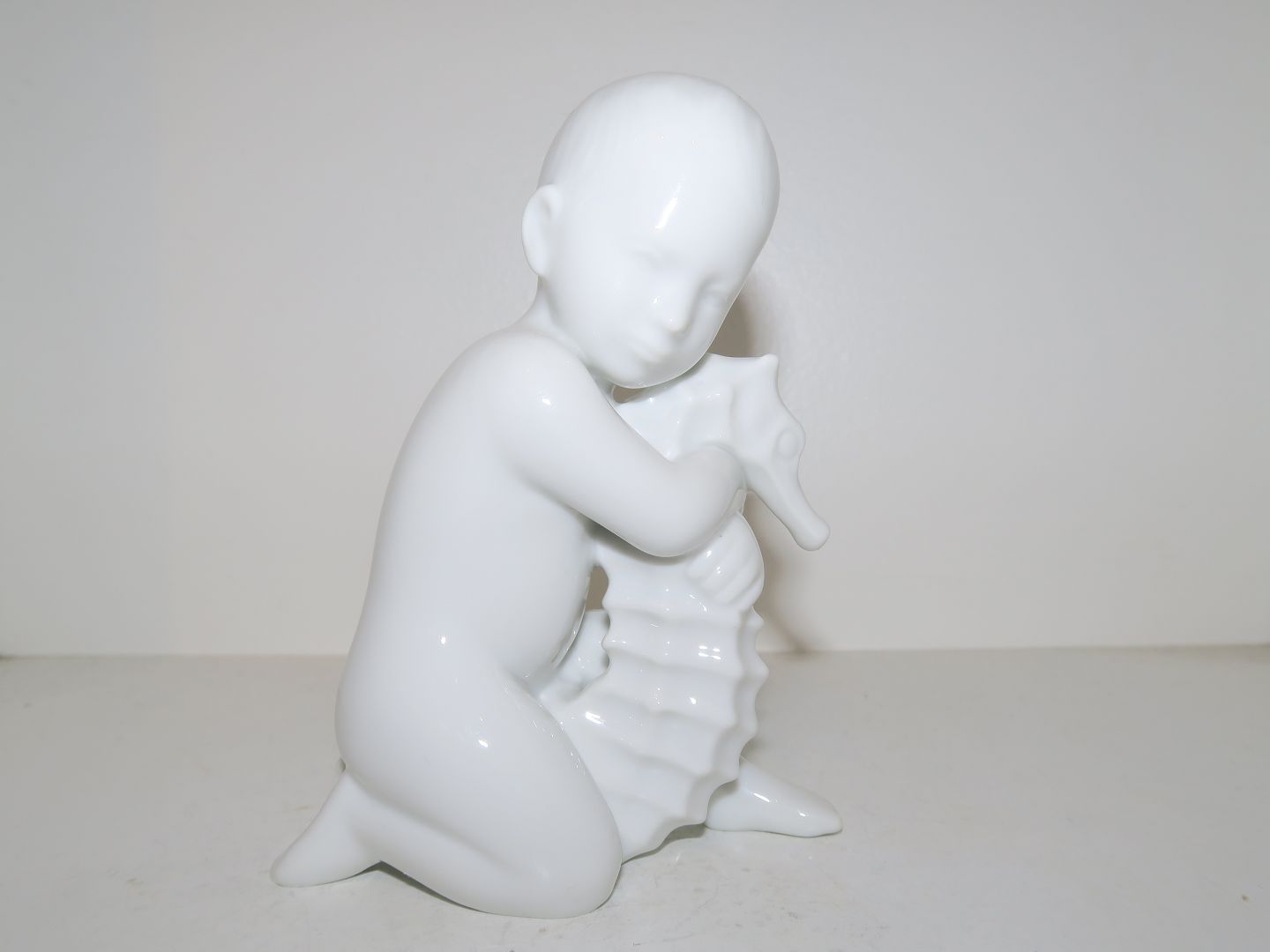Beskrivelse: Hvid Bing & Grøndahl figur, havbarn - dreng med søhest.