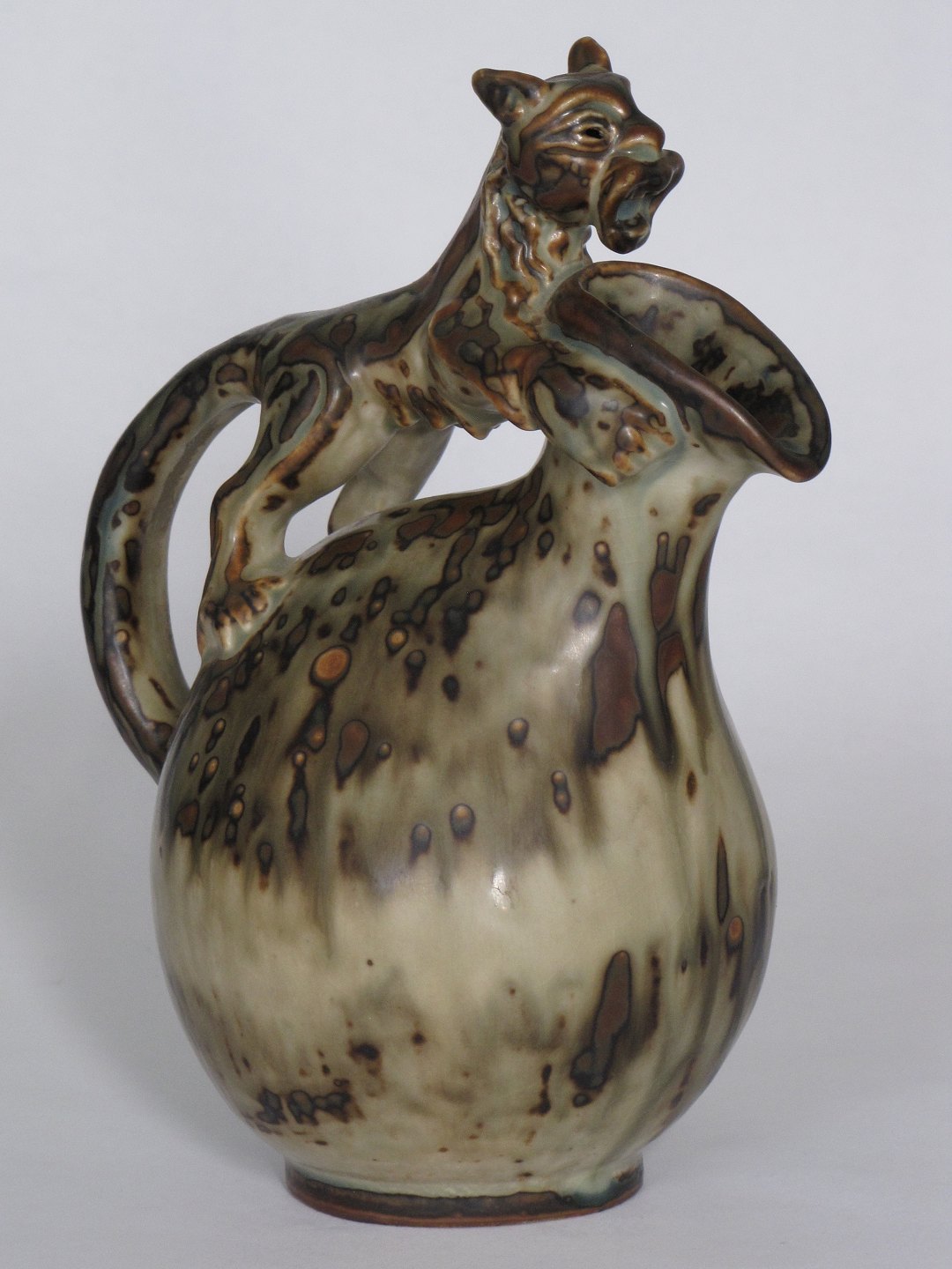 Description: Figure jug by artist Bode Willumsen for Royal Copenhagen. Number 20128. Height 23,5 cm. 17 cm wide. Signed with