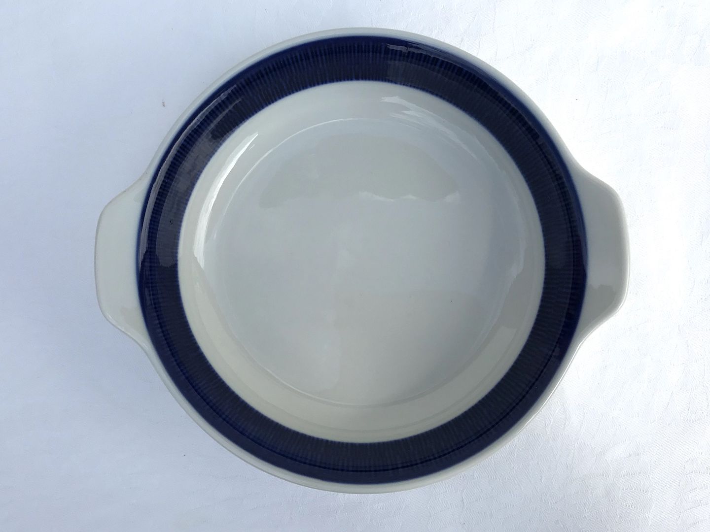 Beskrivelse: Rørstrand, Blå koka, Flad skål med hanke, 19,5cm bred, 17,5cm i diameter, Design Hertha Bengtsson *Perfekt stand*