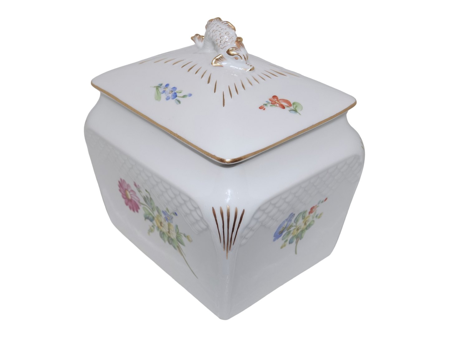 Description: Bing & Grondahl Sachian Flower on white porcelain, lidded box for biscuits.