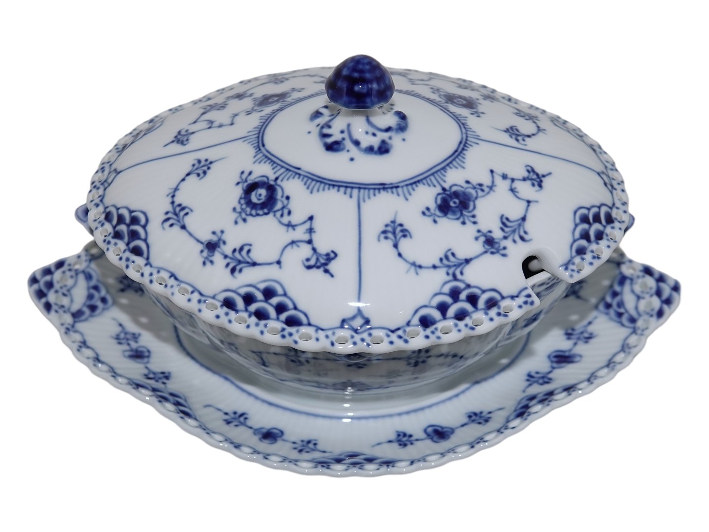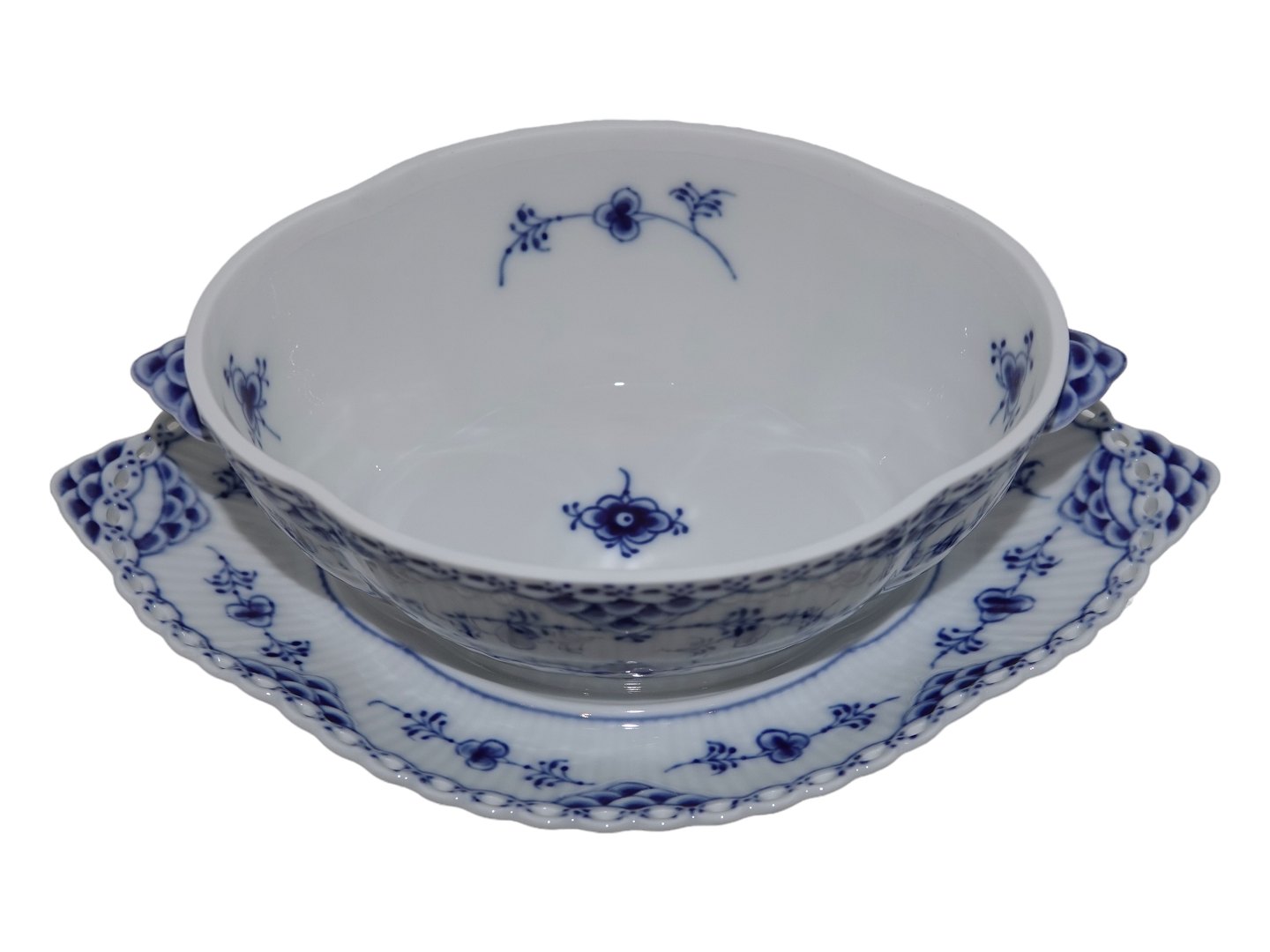 Beskrivelse: Royal Copenhagen Musselmalet Helblonde, sovseterrin (soveskål med låg).