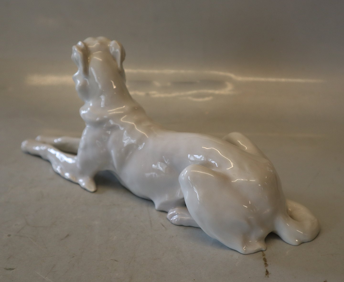 Beskrivelse: Bing & Grøndahl Hund B&G 1811 Liggende hvid mynde 12.5 x 29 cm Lauritz Jensen 1913 I fin og hel stand