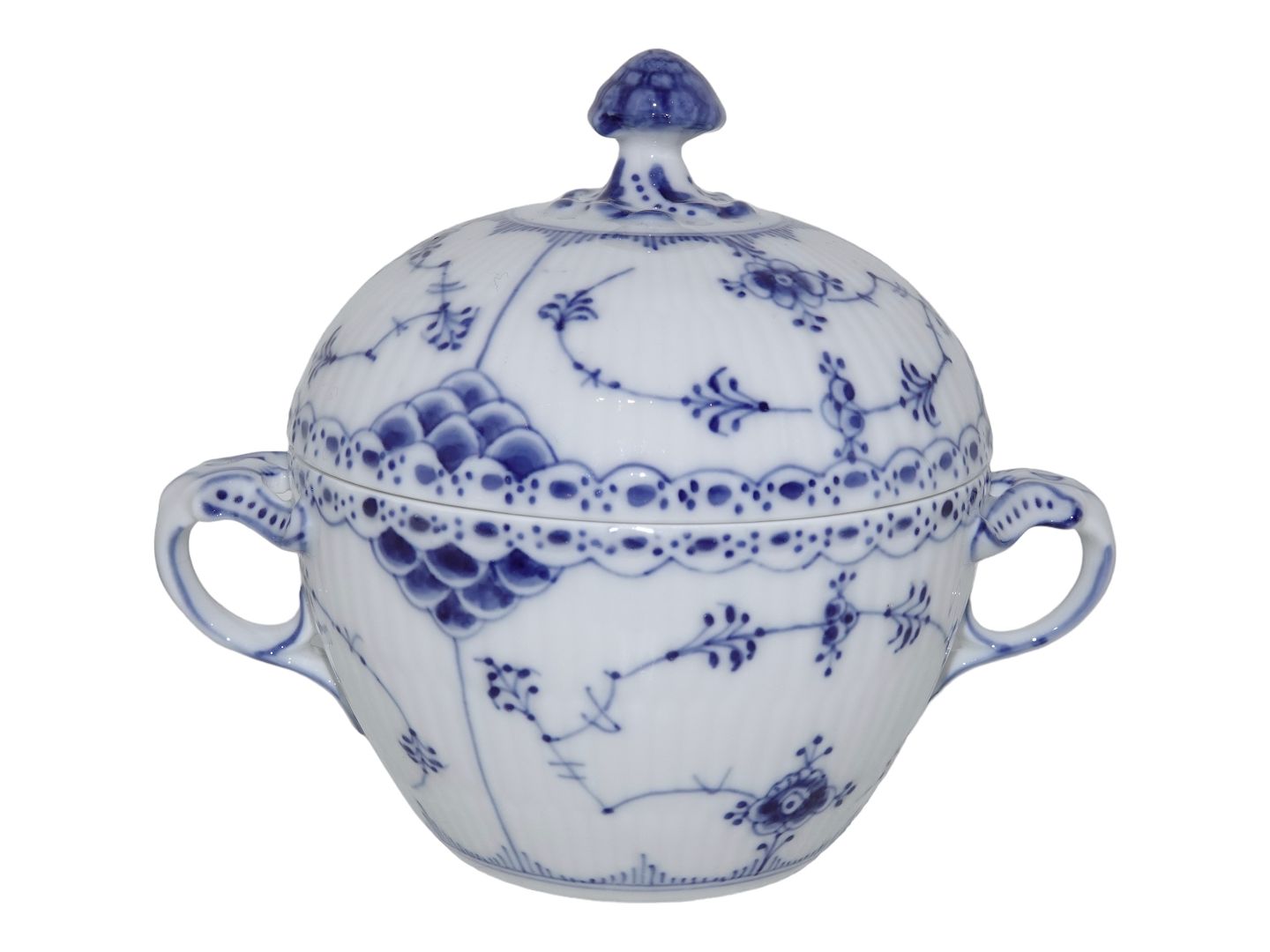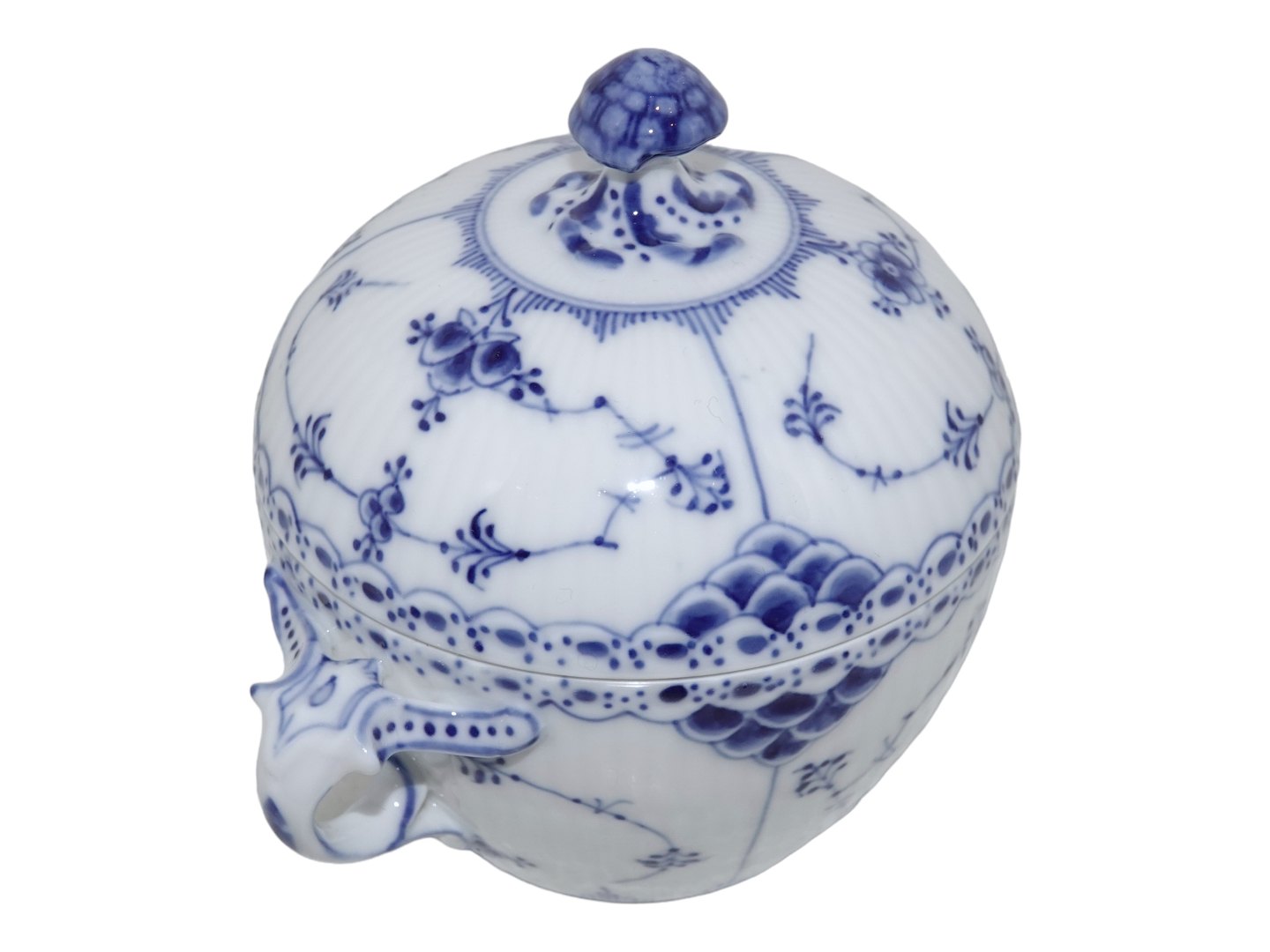 Beskrivelse: Royal Copenhagen Musselmalet Halvblonde, stor sukkerskål.