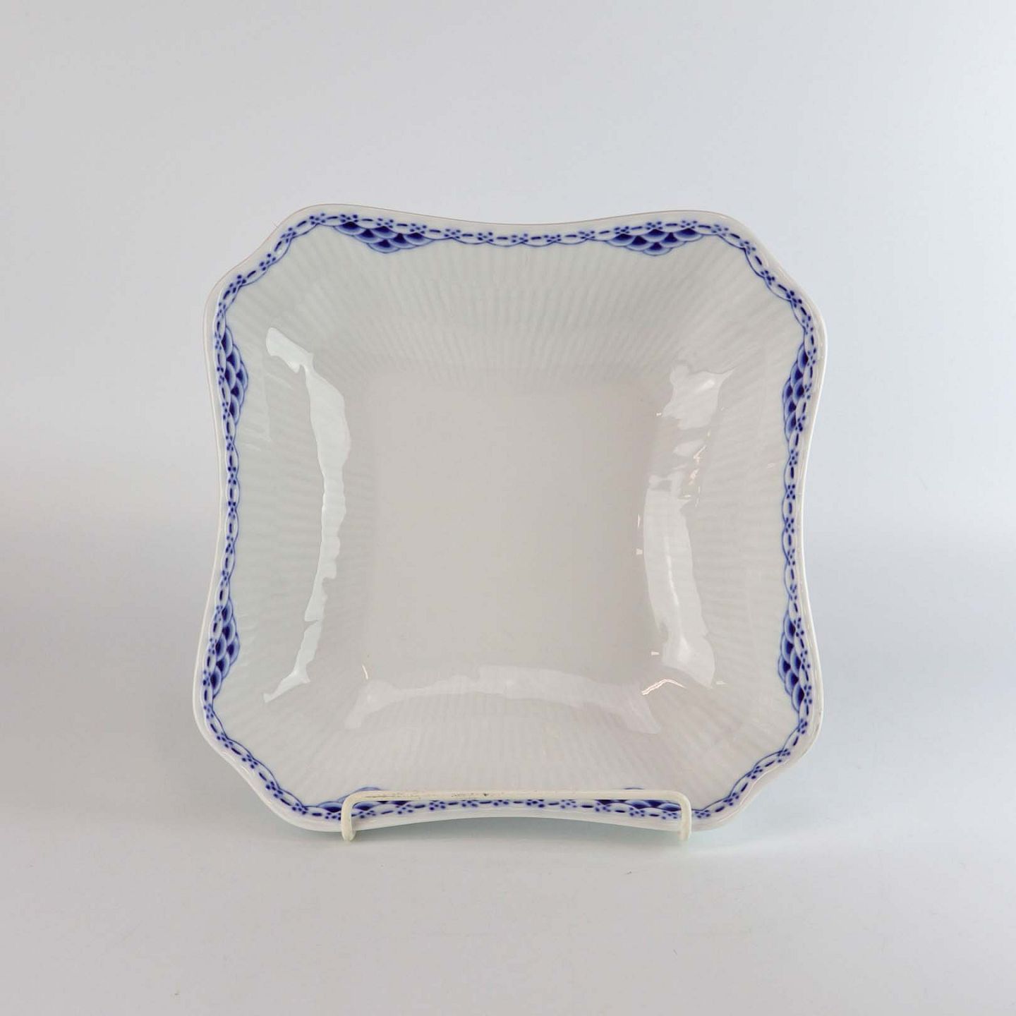 Stellet er fremstillet i riflet hvidt porcelæn med blåmalet blonder og fiskeskældsdekoration