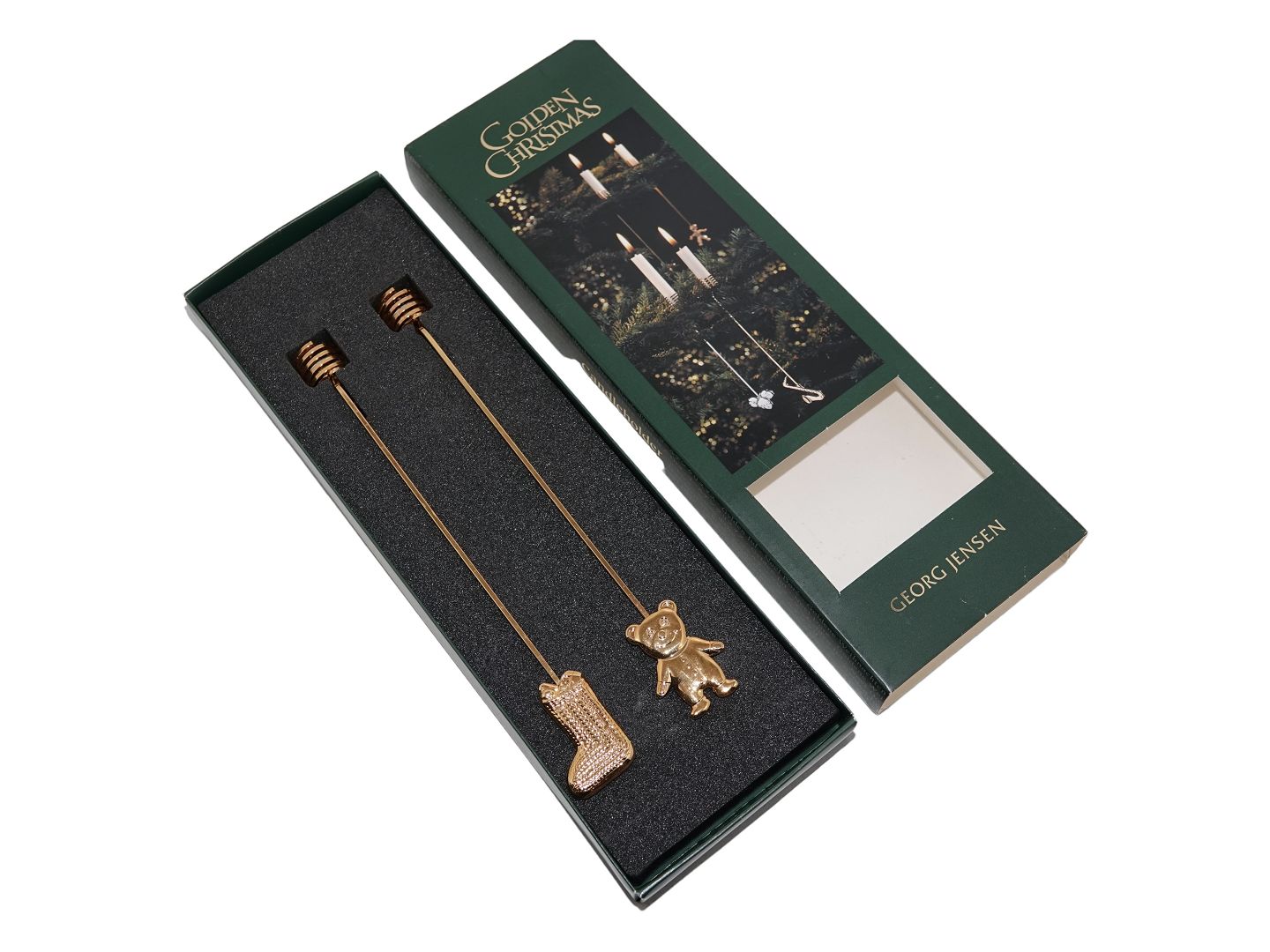 Description: Georg Jensen Golden Christmas Two Golden Christmas Candle holders - bear and sock.