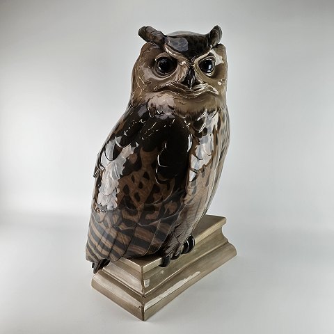 Beskrivelse: Stor figur i porcelæn med motiv af en hornugle siddende på et tagudhæng. Nr. 1846