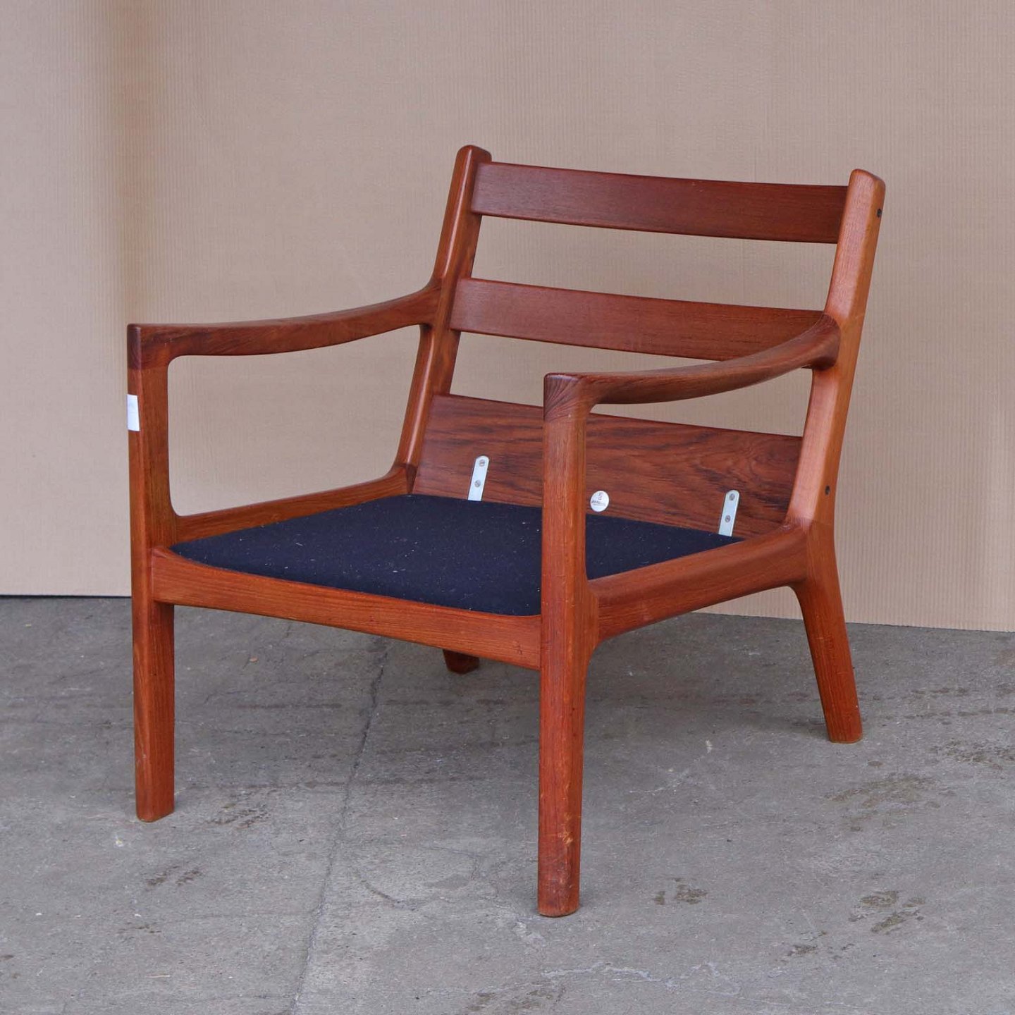 Beskrivelse: Lænestol med stel i lakeret teaktræ og hynder betrukket med lys beige meleret uldstof. Model Senator