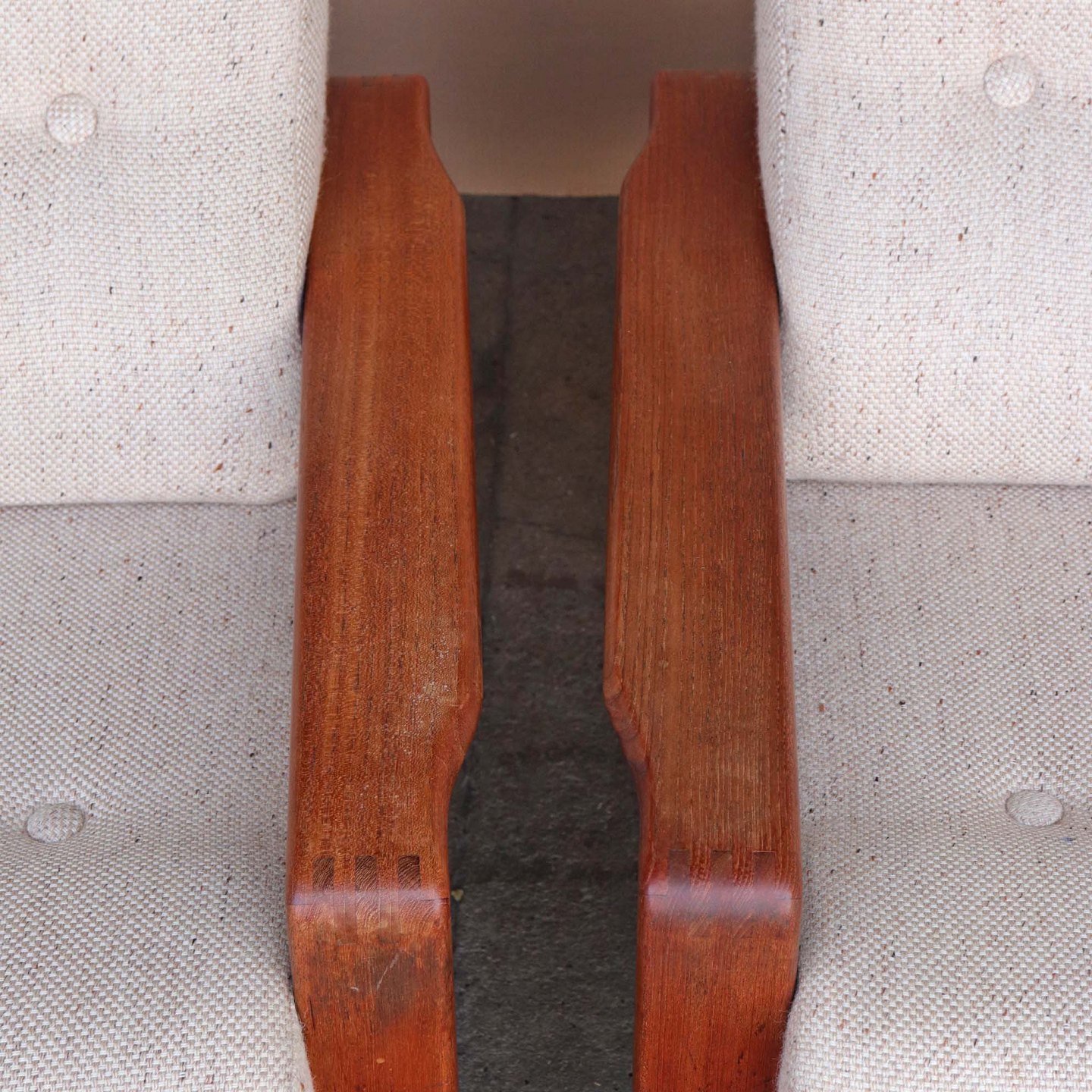 Beskrivelse: Et sæt lænestole med stel i lakeret teaktræ og hynder betrukket med lyst uldstof.