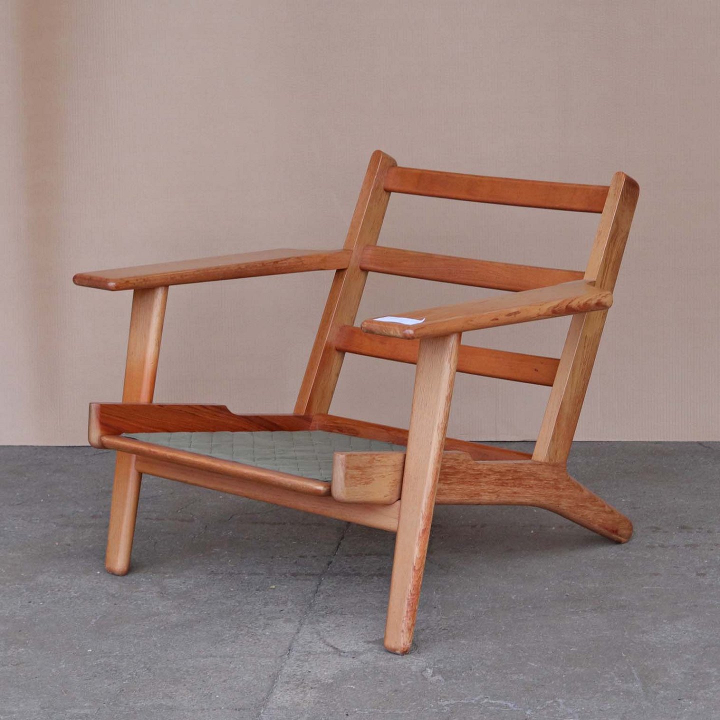 Beskrivelse: Lænestol med stel i lakeret lyst teaktræ og hynder med springfjeder. Hynderne er betrukket med meleret råhvidt uldstof. Model GE 290