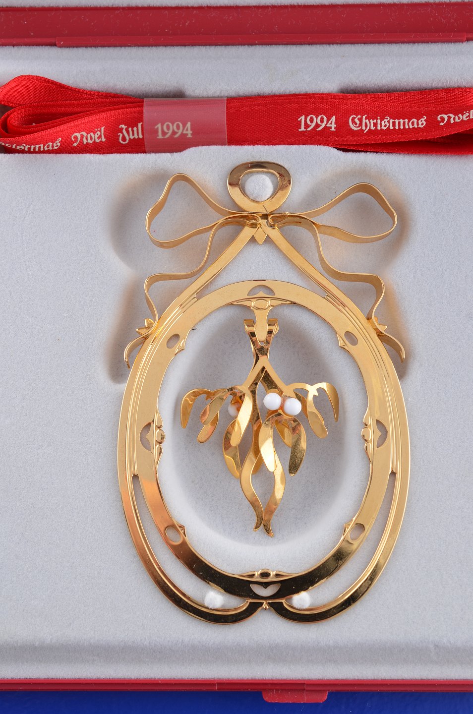 Description: Mistletoe, Christmas Mobile, 1994, The Christmas Ornament from Georg Jensen. Gilded brass. Design : Jette Frölicb. Fine condition, with box.
