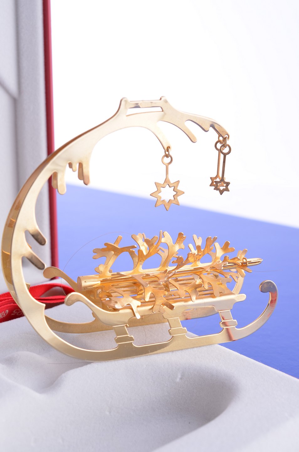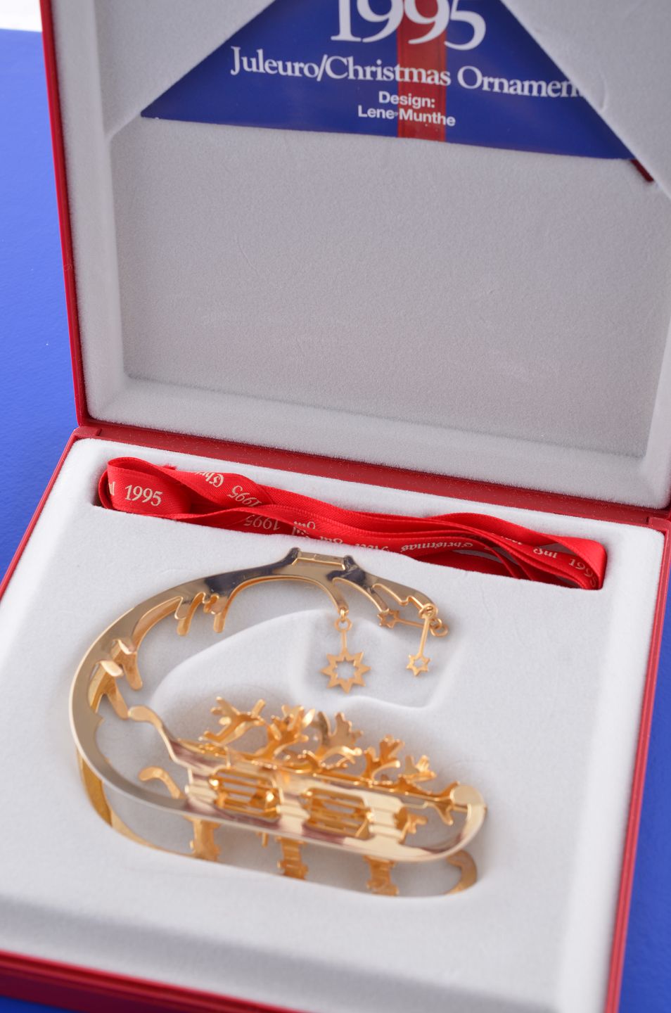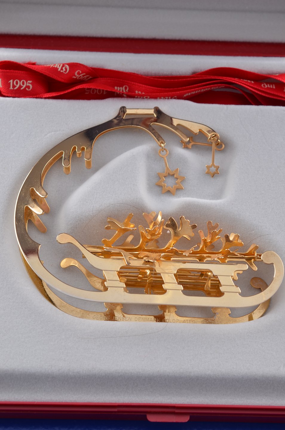 Description: Christmas Sleigh 1995, The Christmas Ornament from Georg Jensen. Gilded brass. Design : Lene Muntbe. Fine condition, with box.