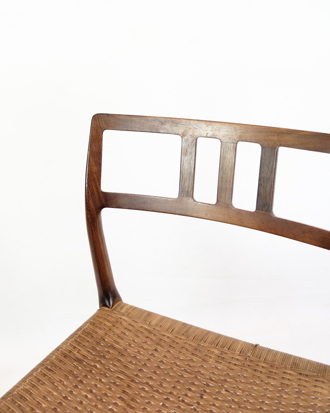 Beskrivelse: Sæt af 4 spisebordsstole, model 79, designet af Niels Otto Møller og fremstillet af JL Møllers Møbelfabrik i 1960’erne. Stolene er udført i palisandertræ med håndflettet sæde i planflet. Et flot eksempel på dansk møbeldesign med fokus på håndværk, form og materialer.