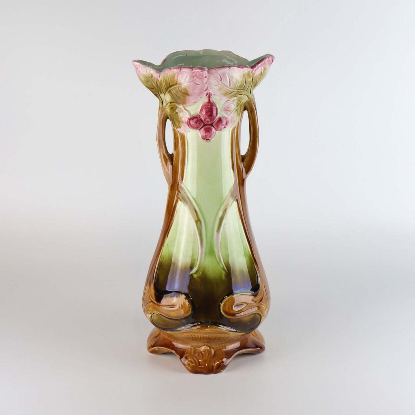 Beskrivelse: Høj vase i fajance i stilen art nouveau Majolica dekoreret med blade og bær. Nr. 6084