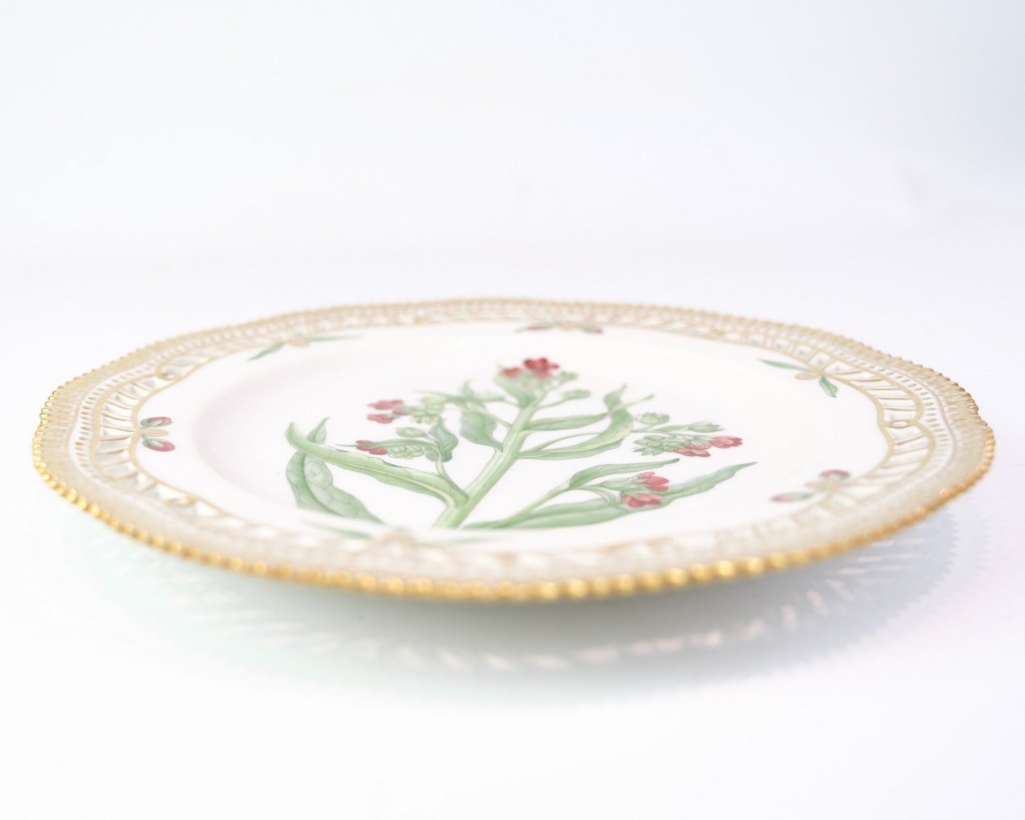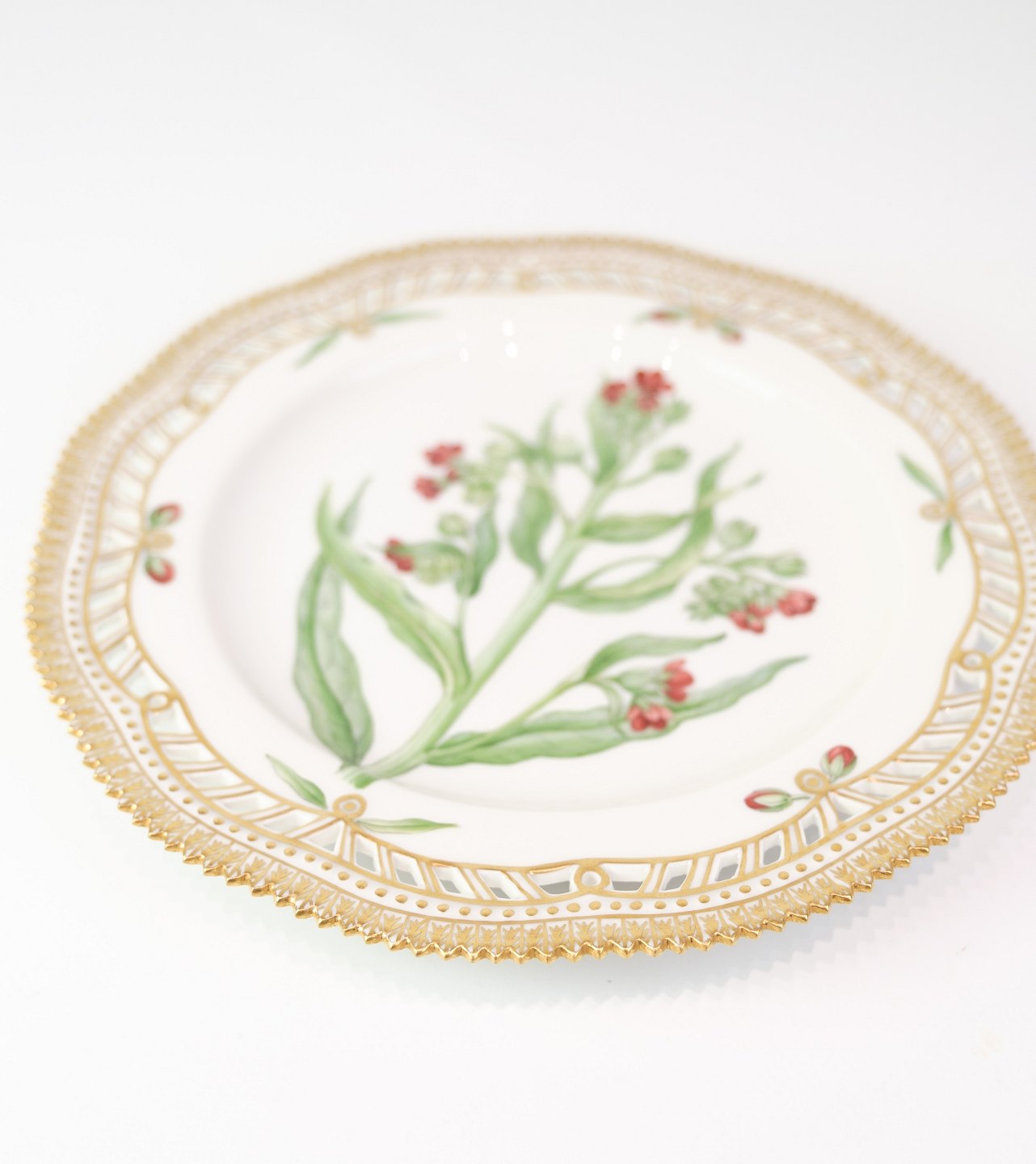 Beskrivelse: Håndmalet frokosttallerken fra Royal Copenhagens Flora Danica-serie, udført i porcelæn og dekoreret med motiv nr. 20/3554. Tallerkenen har gennembrudt blondekant og guldfinish.