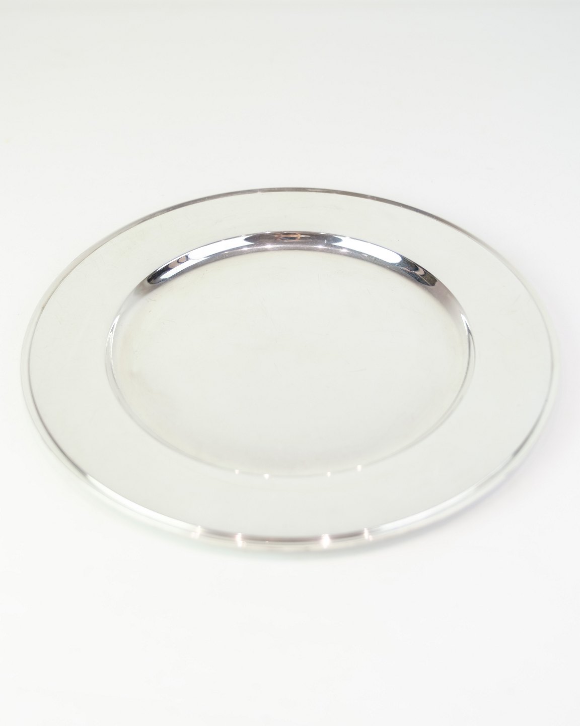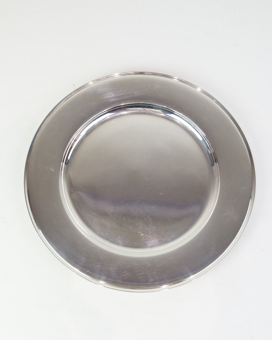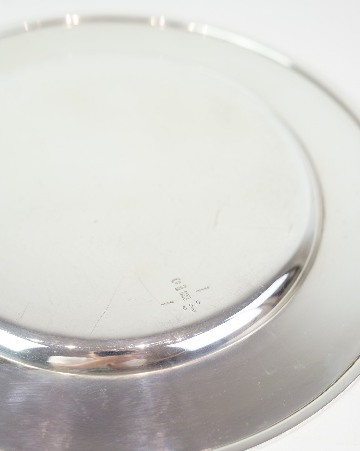 Description: Georg Jensen sterling silver place setting plate, Pyramid model No. 600E. Diameter 26 cm, weight 522 g. Elegant Danish design classic.