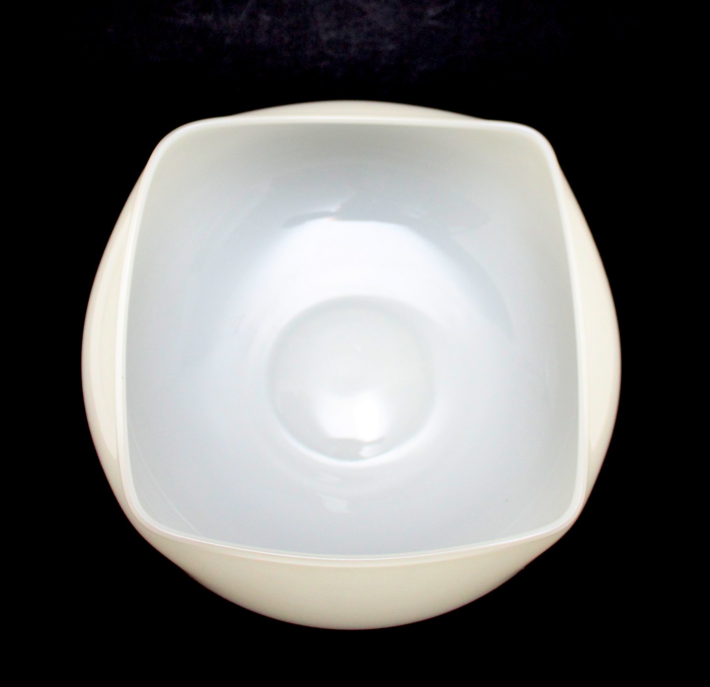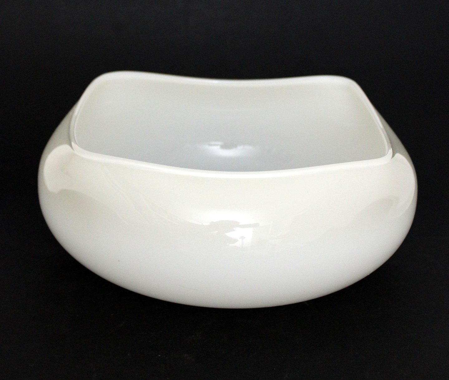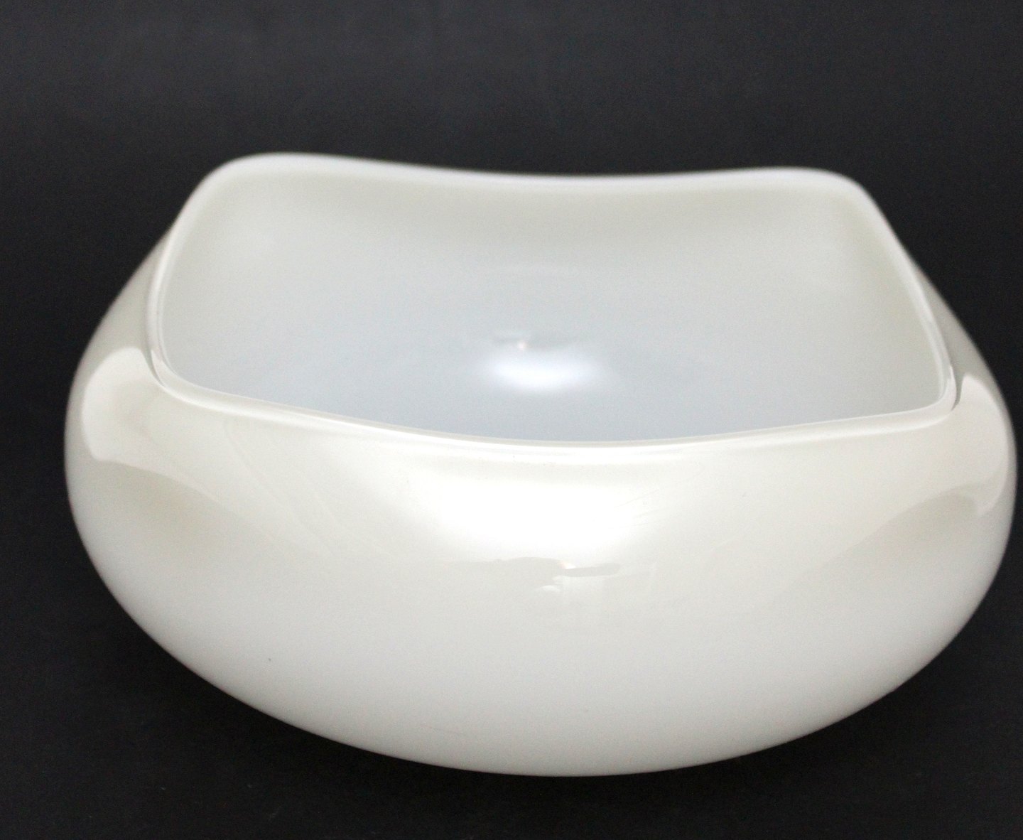 Beskrivelse: Holmegaard, Quadro Art glass. Cremehvid skål med firkantet top og kugleformet bund. Designet af Peter Svarrer i 2003. Quadro er en brugskunst serie i forskellige former og farver, der starter i 1998 og udgår af produktion i 2004. Skålen var dyr at fremstille pga. den firkantede top kombineret med den runde bund. Højde 10 cm. Diameter 22 cm. II sortering. Fin stand. Pris: 425 kr. stk. Lager: 1