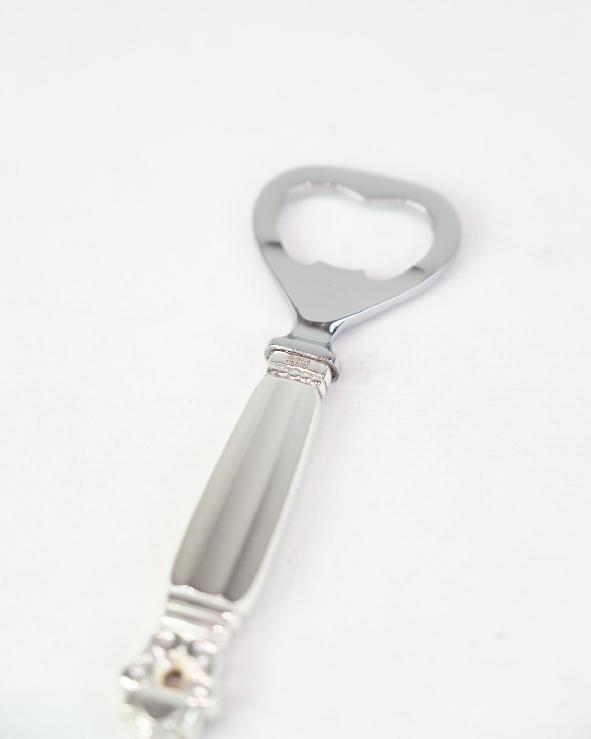 Description: Georg Jensen bottle opener in King pattern. Sterling silver and stainless steel. Design by Johan Rohde. Length 16 cm.