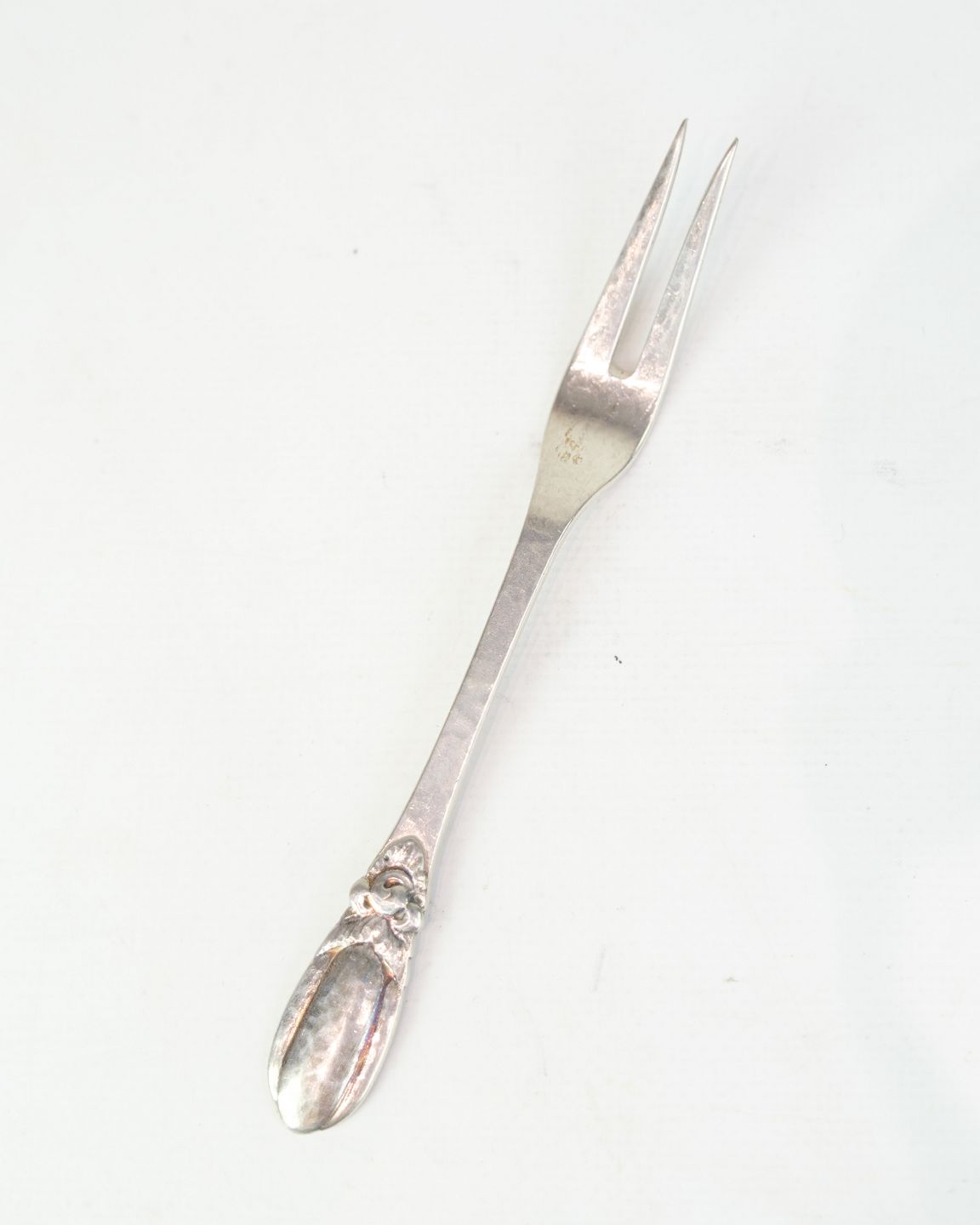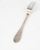 Beskrivelse: Evald Nielsen pålægsgaffel i ægte sølv. Hammerslået mønster, Model No. 16. Længde 15 cm. Klassisk dansk sølvarbejde.