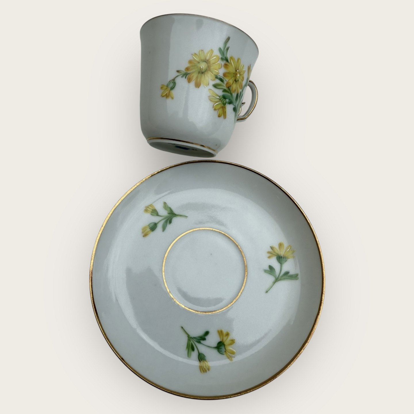 Beskrivelse: Royal Copenhagen, lille kaffekop i tyndt porcelæn dekoreret med Gul marguerit, #9075, Kop højde 5,5cm, diameter 6,3cm, underkop diameter 8,5, Pæn stand