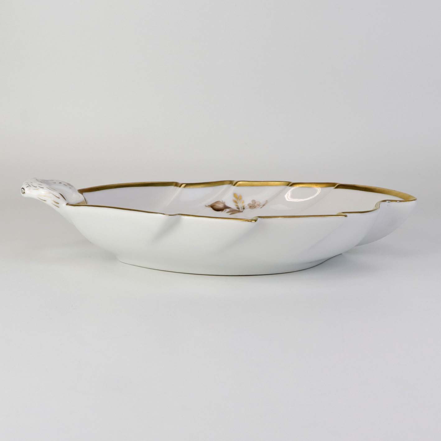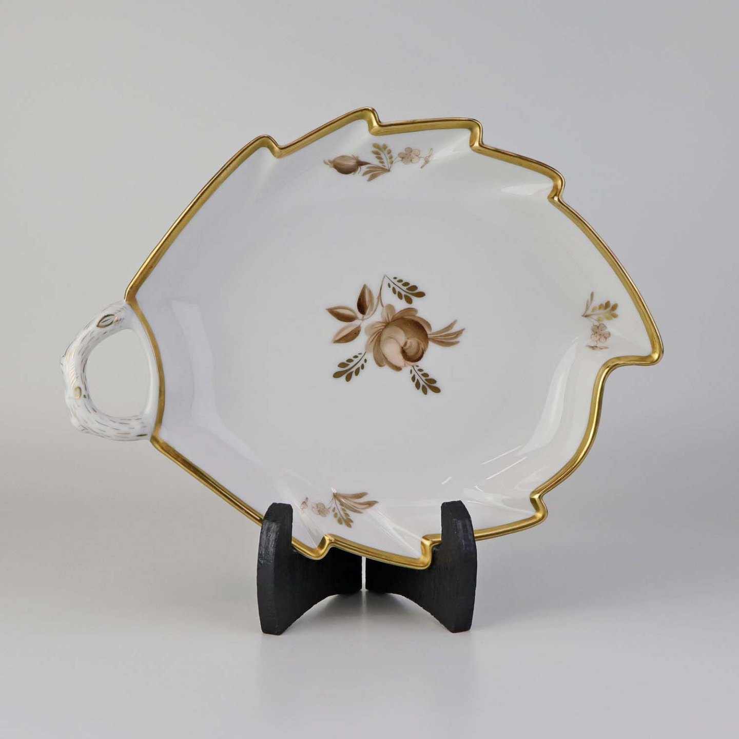 Beskrivelse: Bladformet kagefad i porcelæn fra stellet Brun rose. Nr. 688/9209