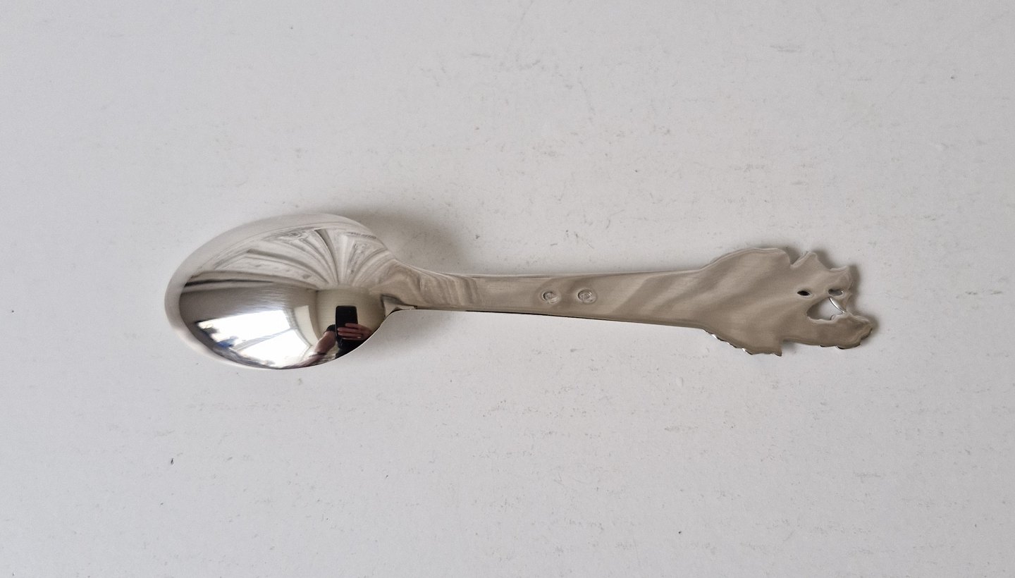 Beskrivelse: H.C.Andersen barneske i sølv - "Lille Claus og store Claus"