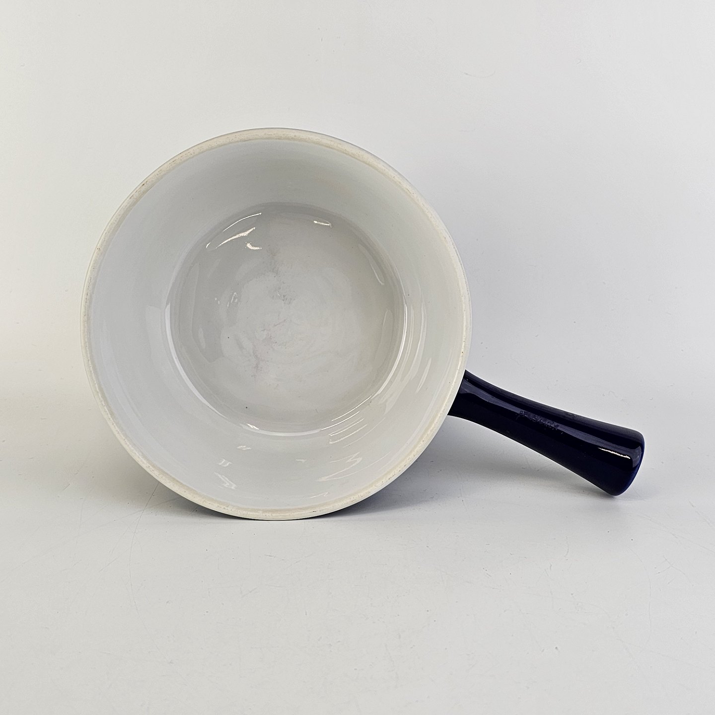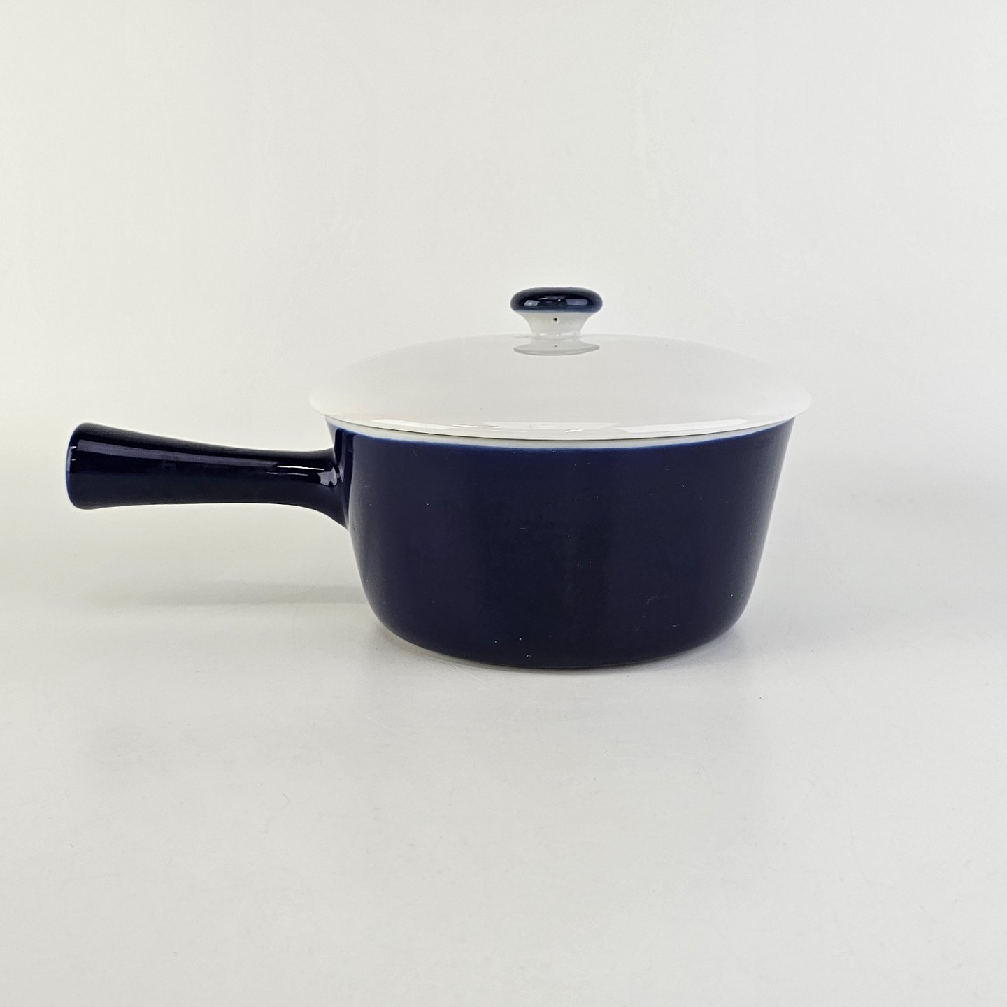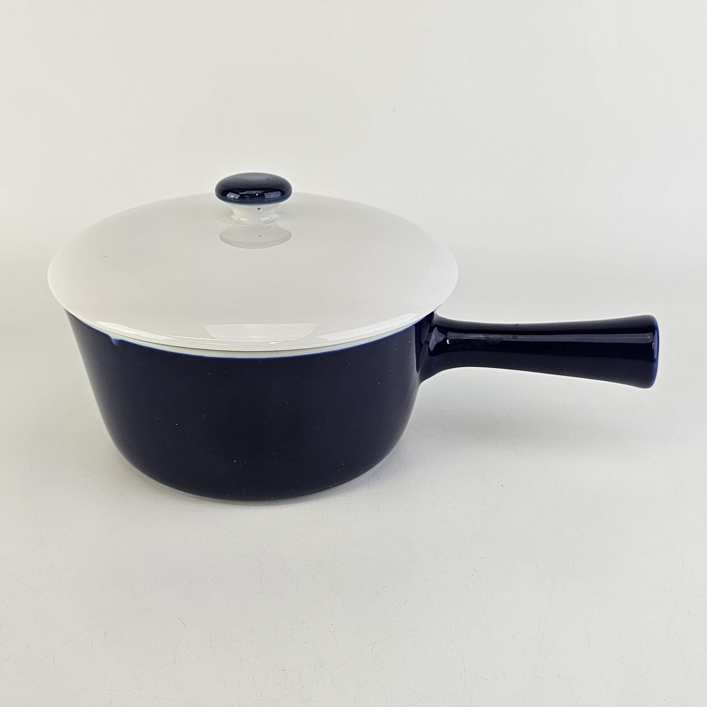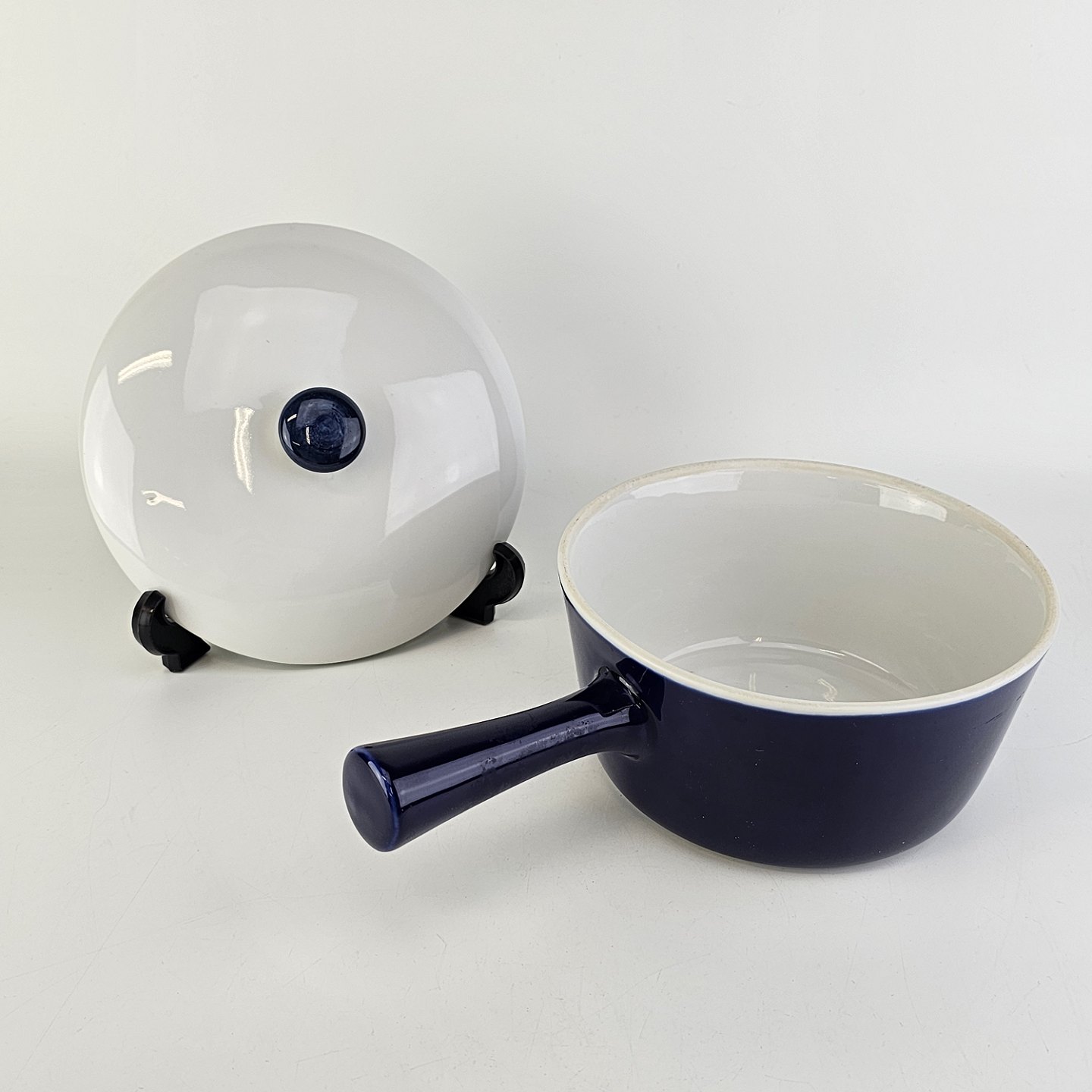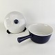 Beskrivelse: Kasserolle med låg i porcelæn fra stellet Blå Glasurfarvet