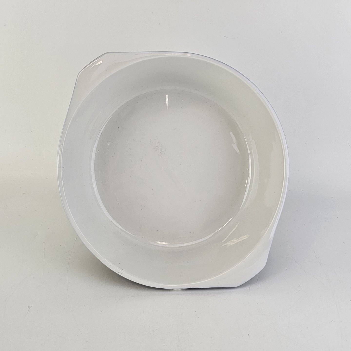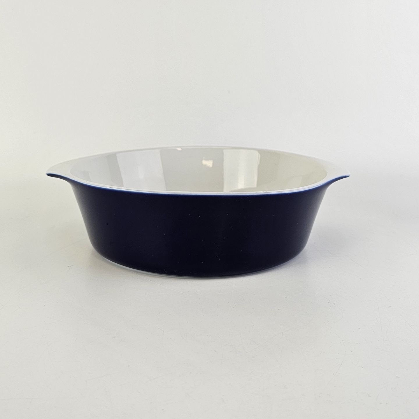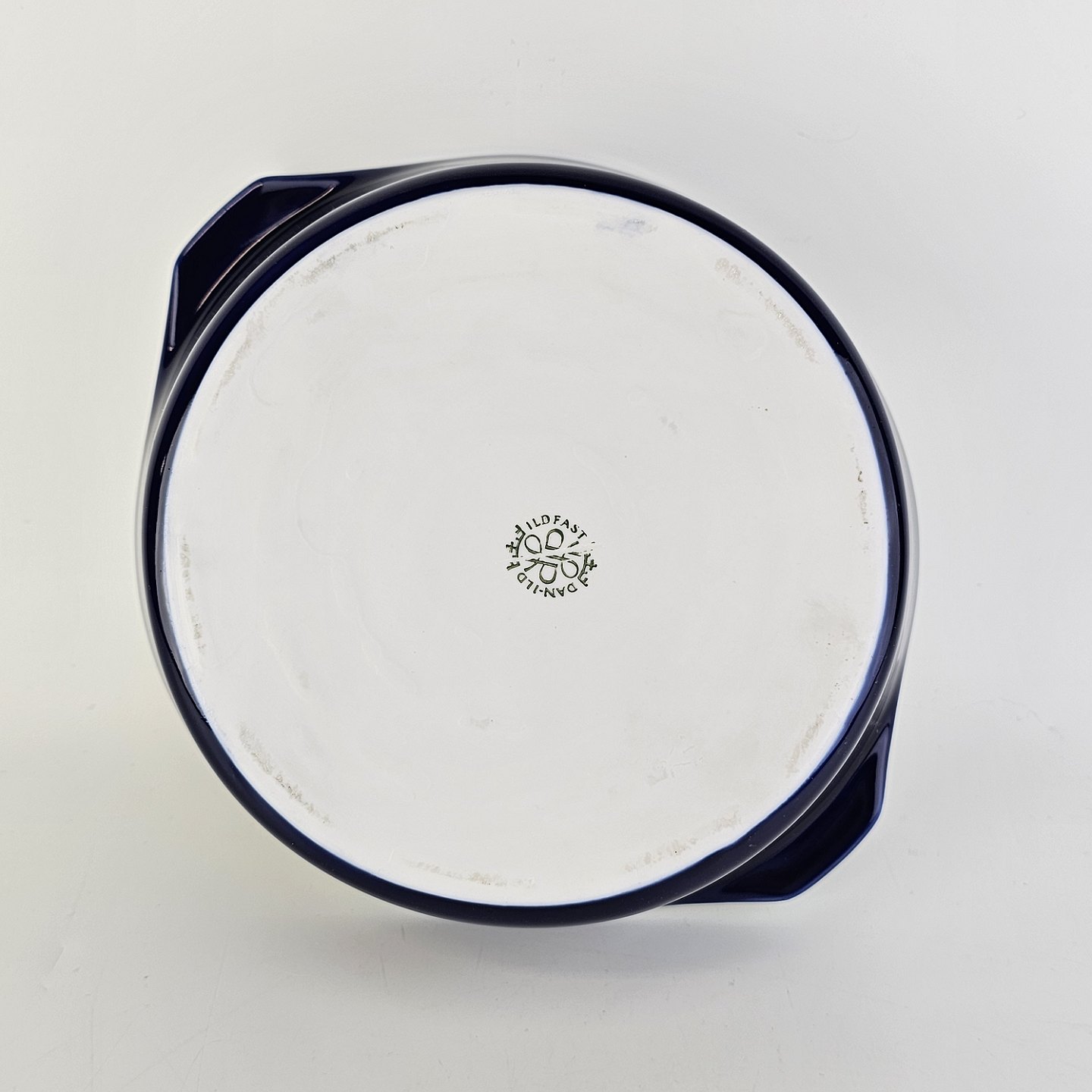 Beskrivelse: Skål med håndtag i porcelæn fra stellet Blå Glasurfarvet