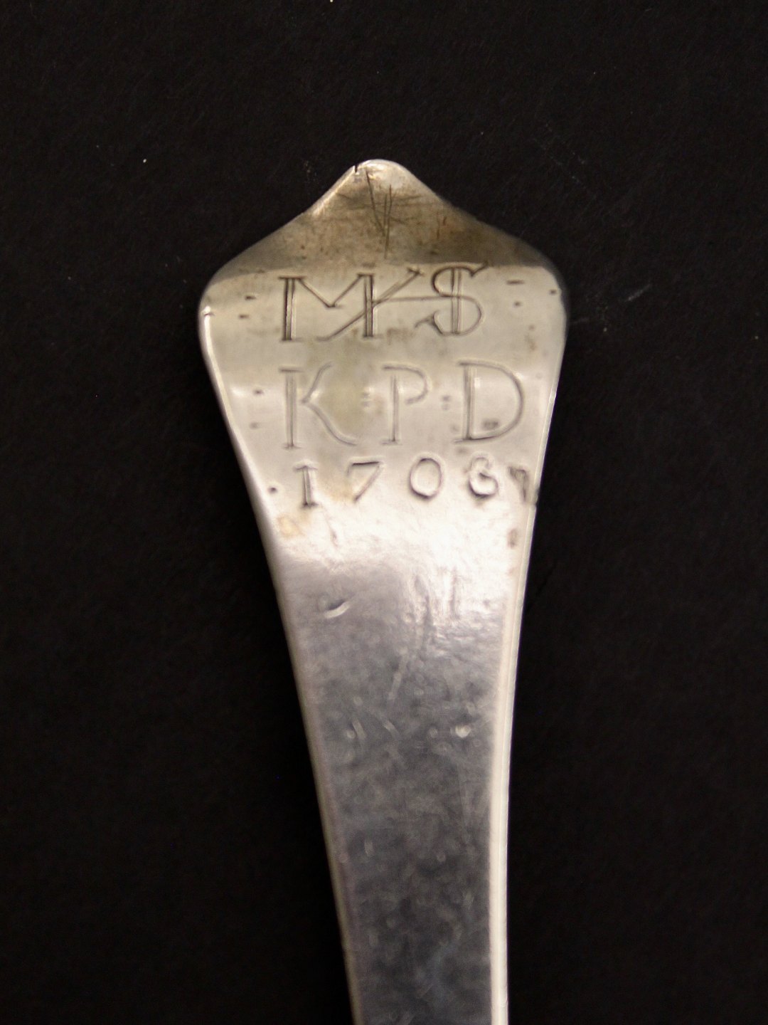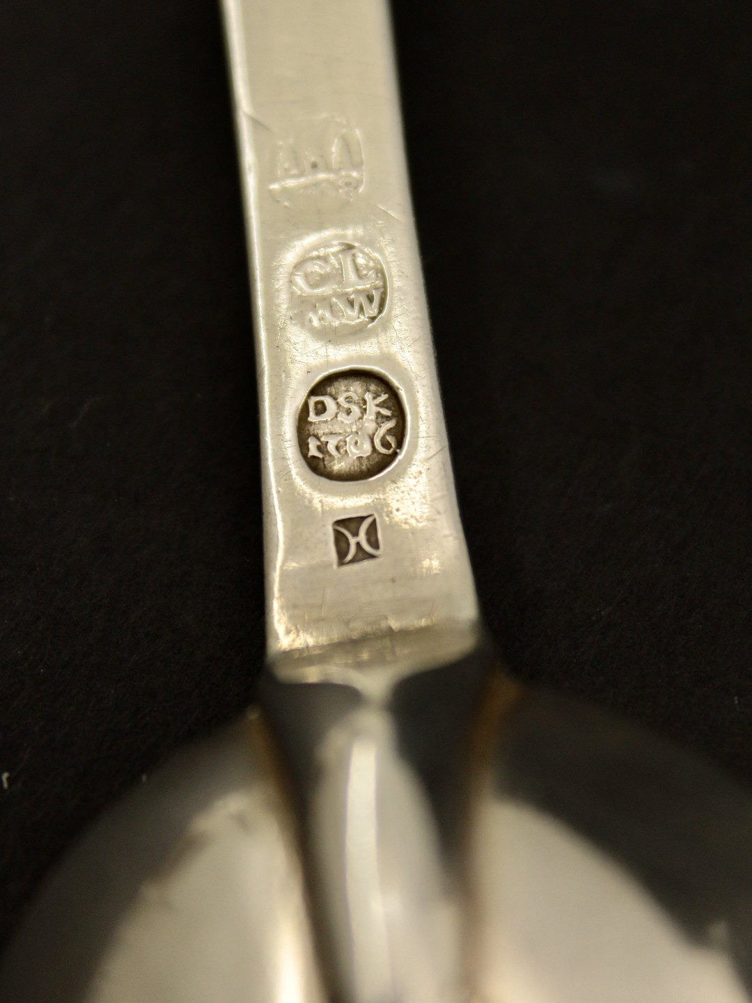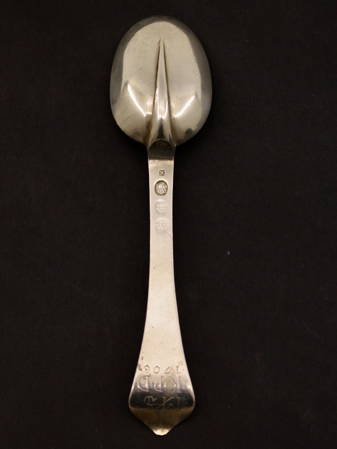 Beskrivelse: Sølvske med rottehale år 1706 fra sølvsmed D Schwartzkopf København 1698-1736 emne nr. 619593