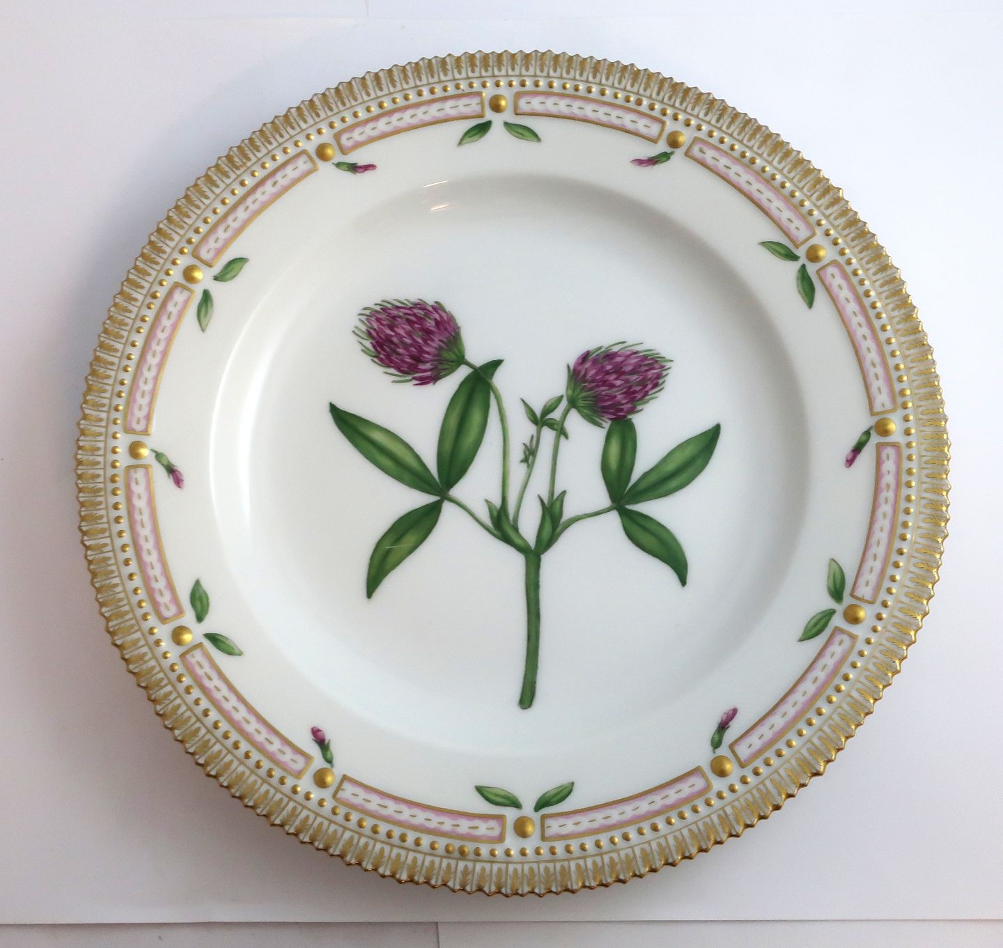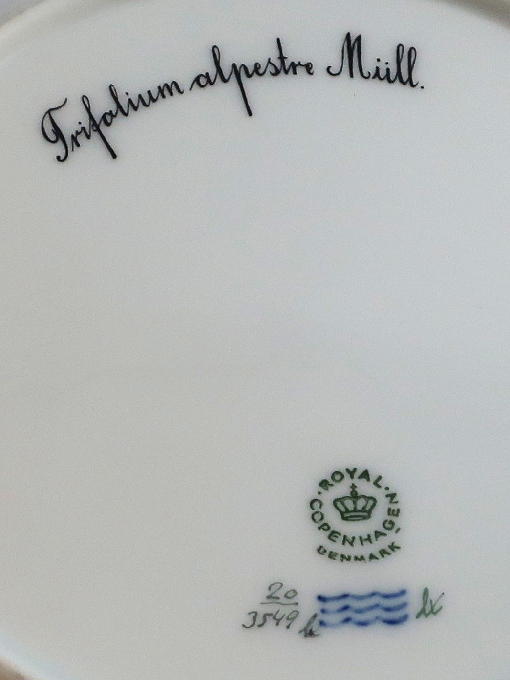 Description: Royal Copenhagen Flora Danica. Dinner plate. Design # 3549. Diameter 25 cm. (1 quality). Trifolium alpestre Mill