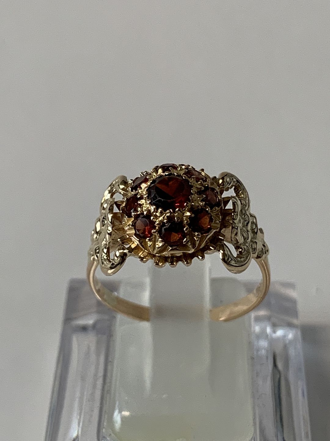 Description: This beautiful ladies' ring in 14 carat gold is something quite special. With the many beautiful ornaments, the ring is a complete work of art. The beautiful red stones on top of the ring give a dynamic and vibrant look.