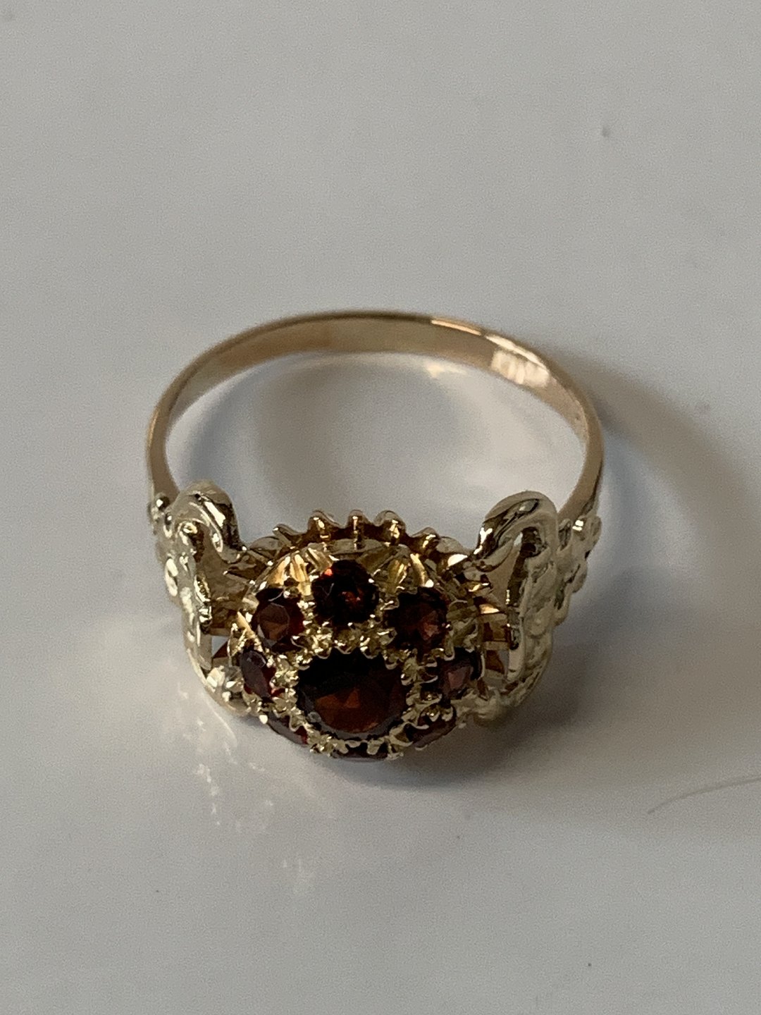 Ladies' ring in 14 carat gold with red stones and beautiful ornamentation. Size 58, stamped 585.