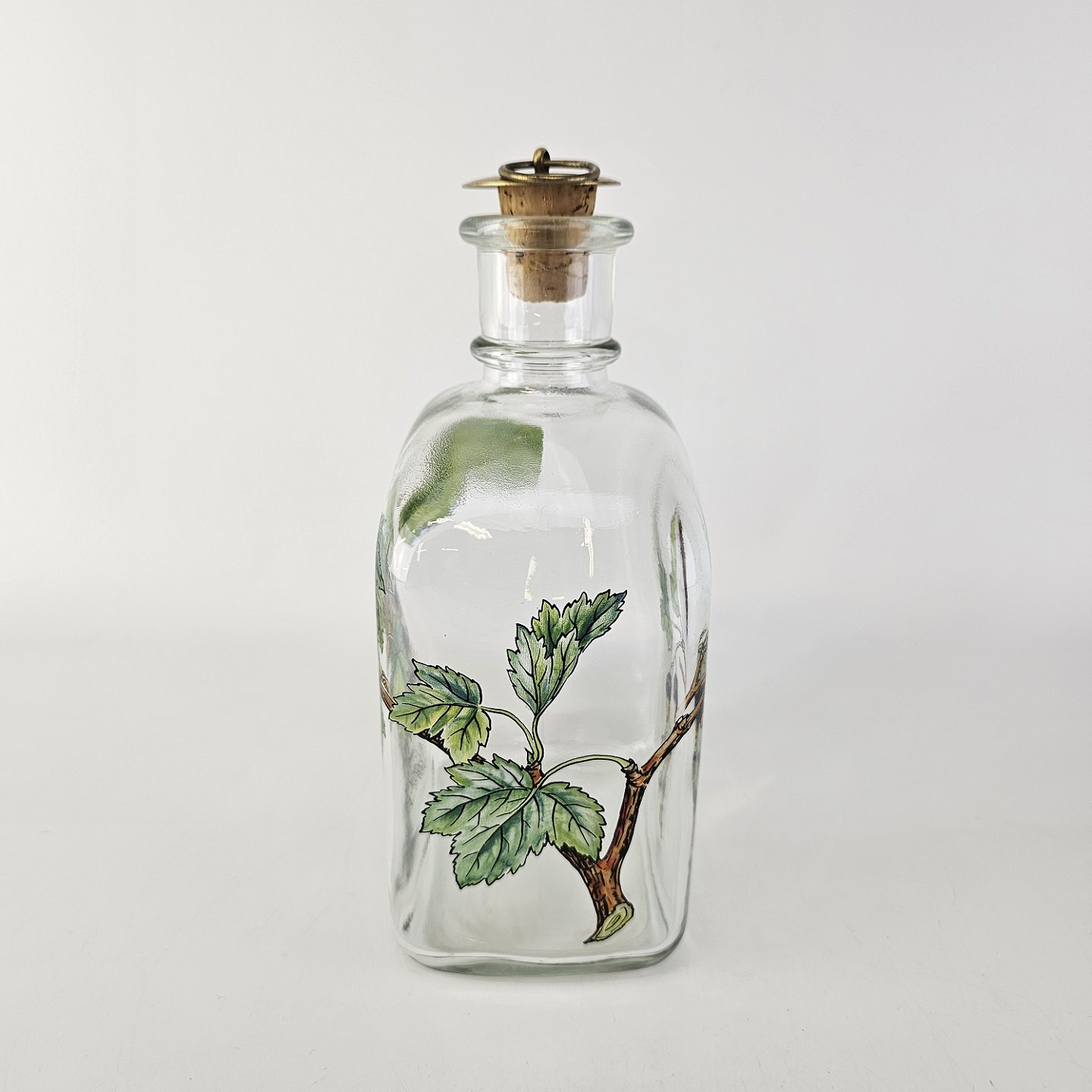 Beskrivelse: Karaffel i klart glas med korkprop fra serien Brændevins Amatøren, dekoreret med en gren af solbær og teksten Ribes Nigrum L.