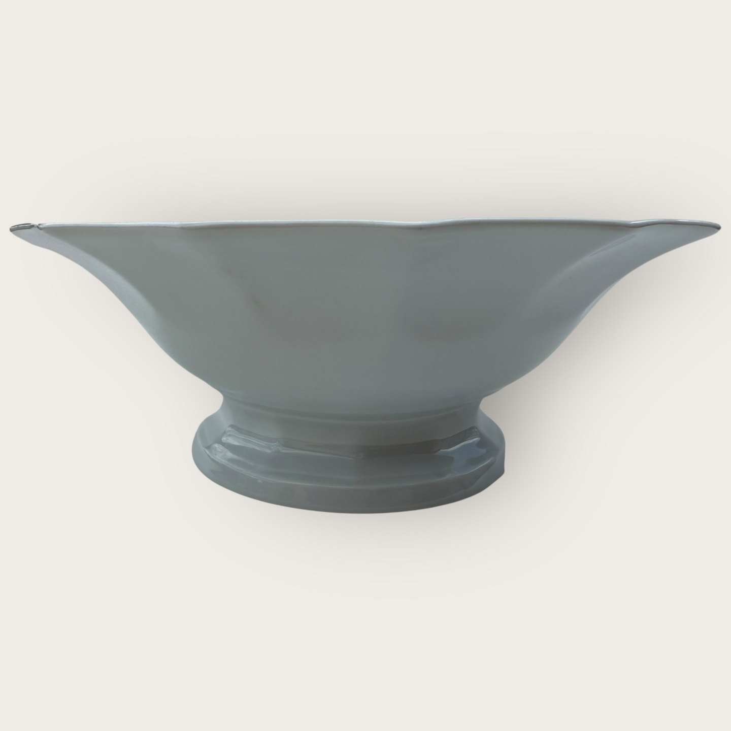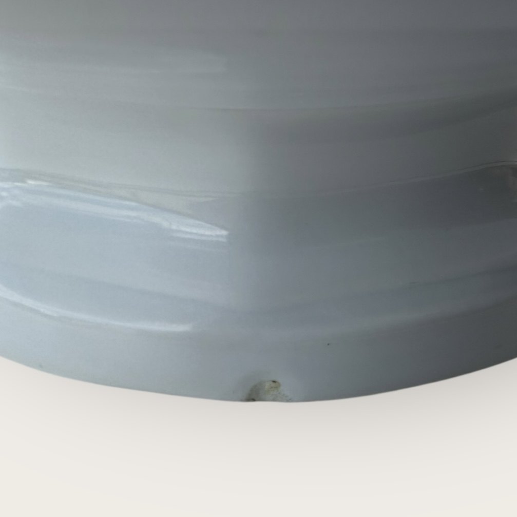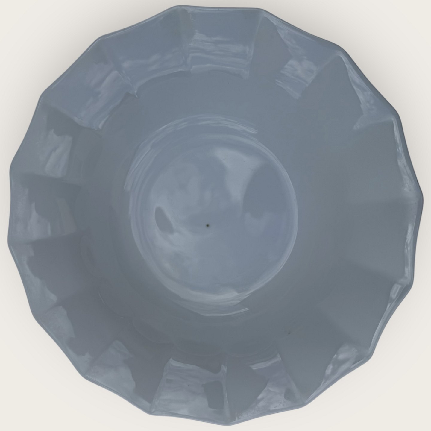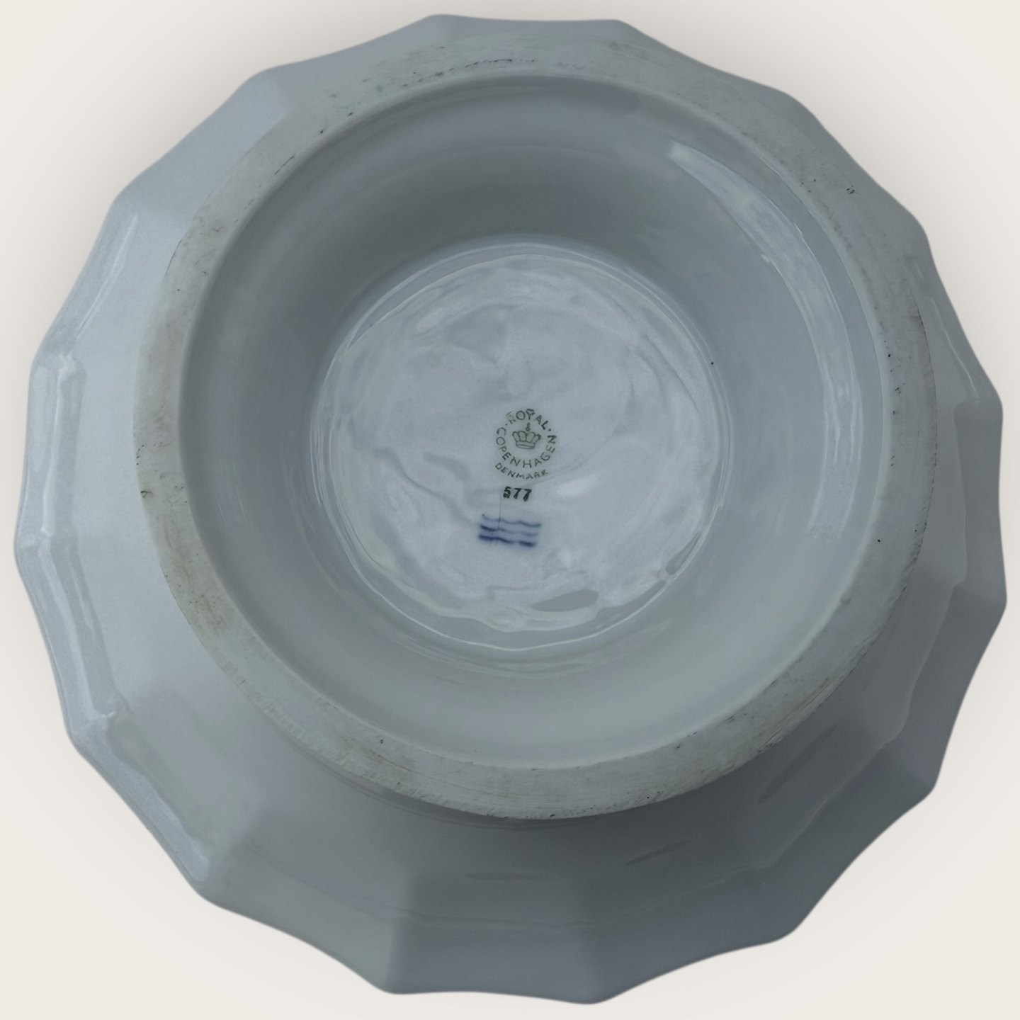 Description: Royal Copenhagen, Hvid kantet / White edged without decoration, Round bowl on foot #577, 23.5cm in diameter, height 9cm, 3rd grade, A stain on the bottom and a small flaw on the foot (see photo).