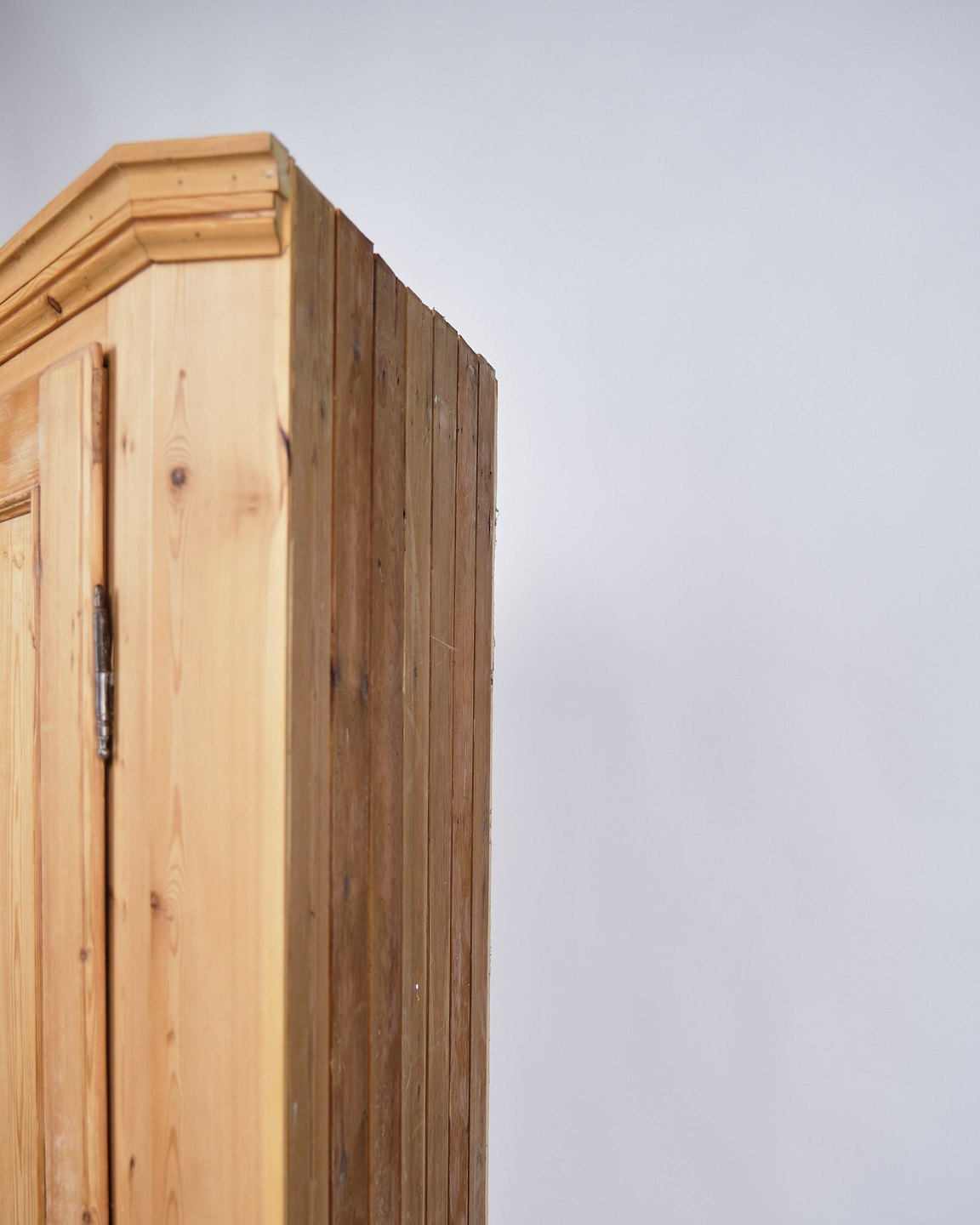 Beskrivelse: Antikt hjørne fra 1920’erne udført i massivt fyrtræ med originale messingbeslag.