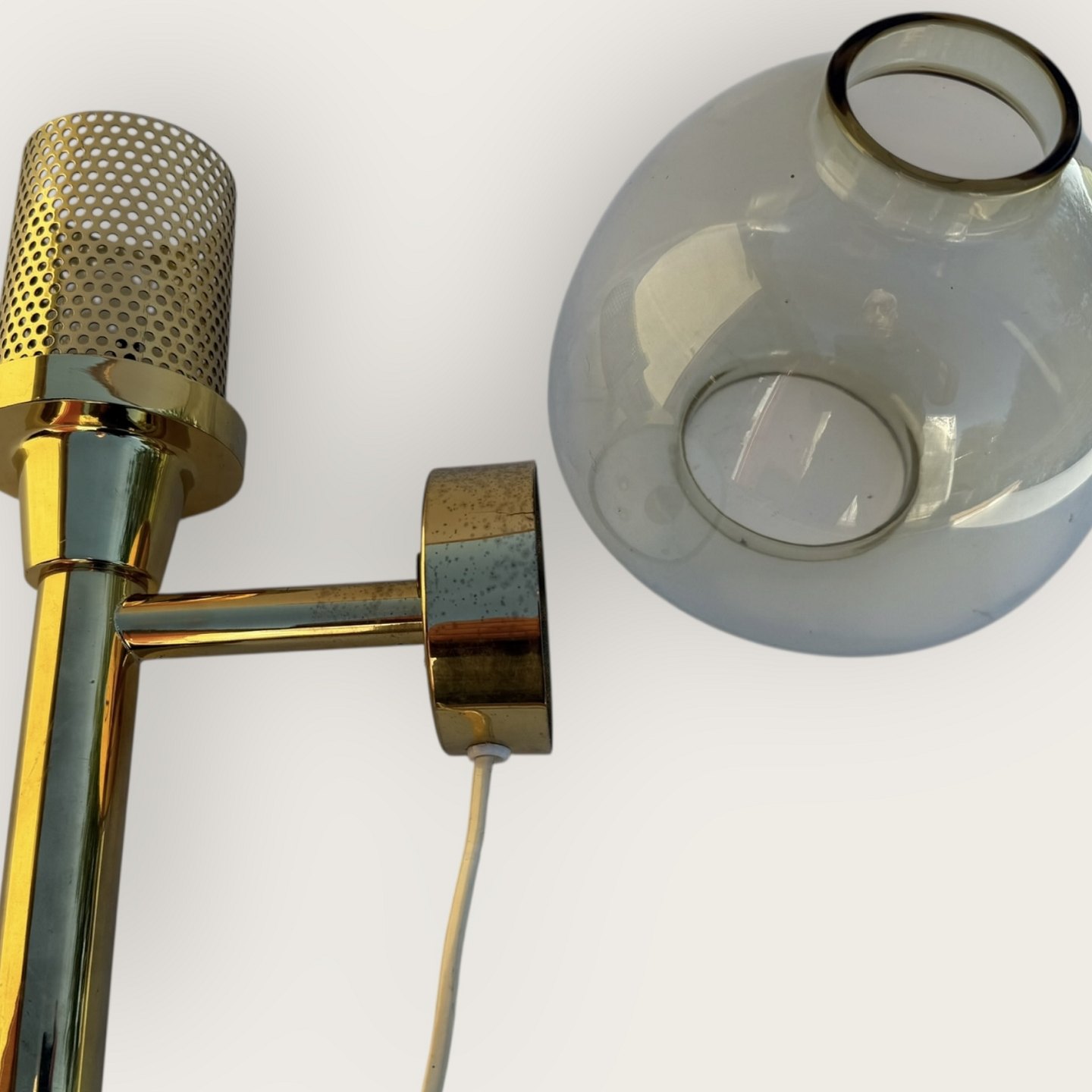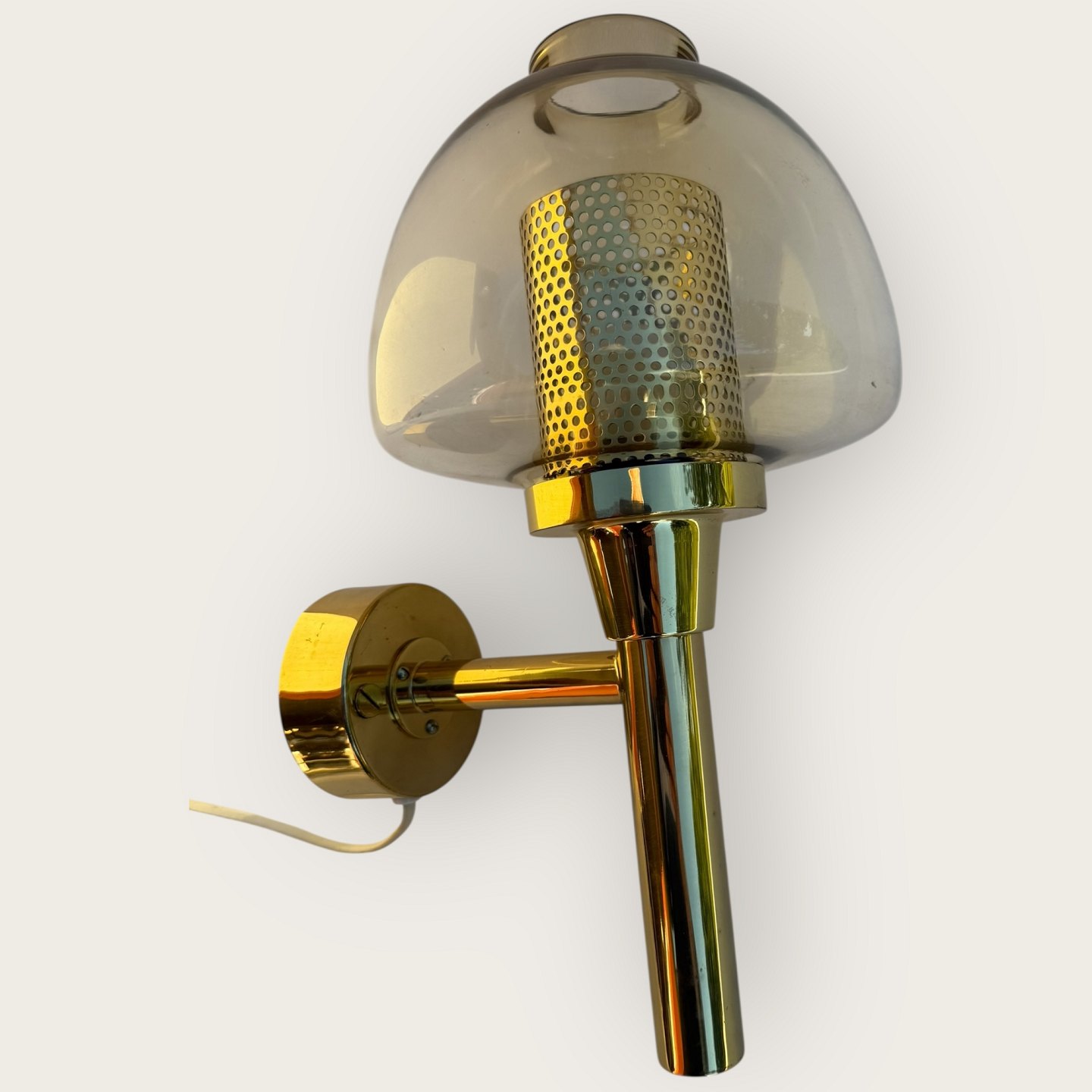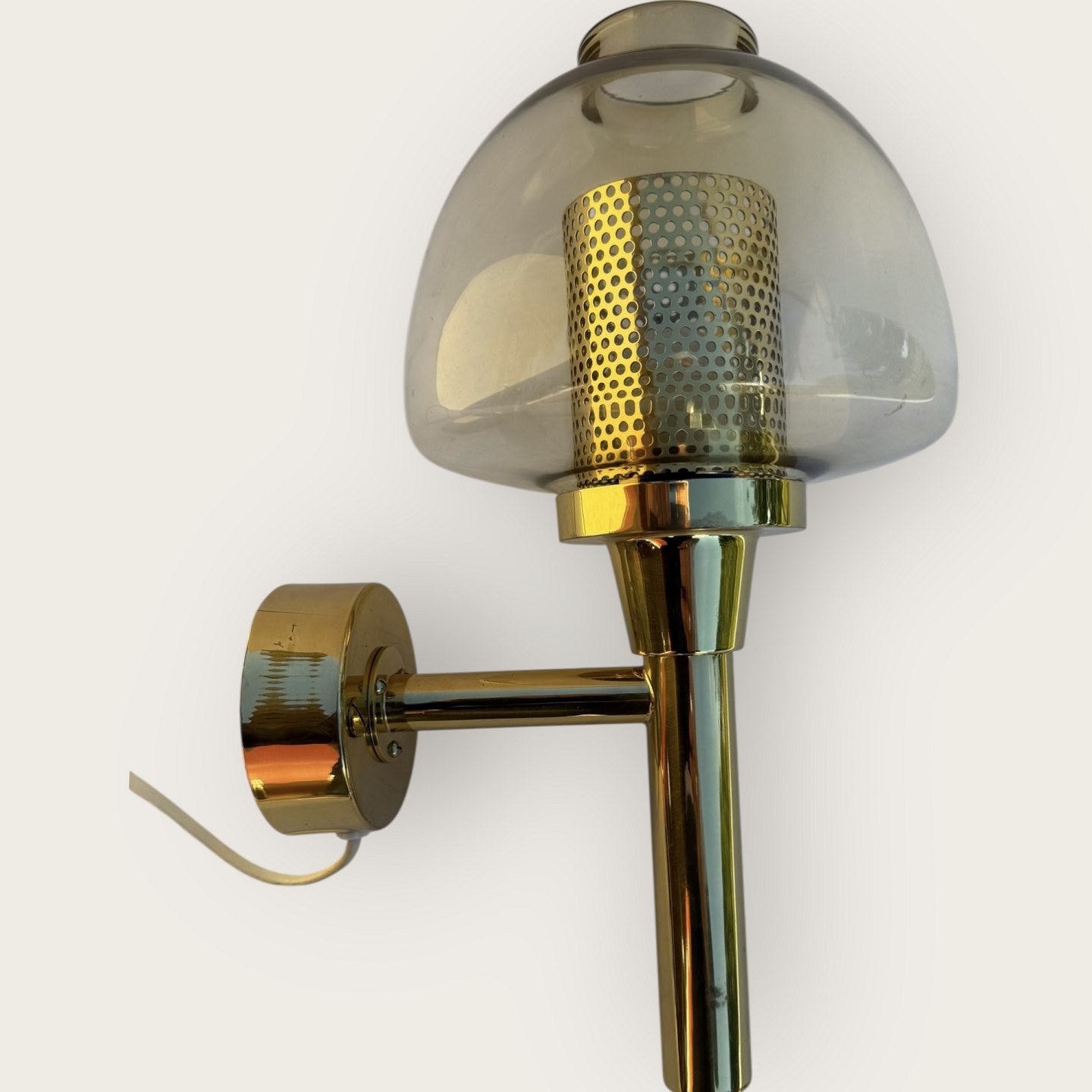 Beskrivelse: Hans Agne Jakobsson, # 314, væglampe, messing og glas, Højde ca 32cm, meget lille sprække/patinering på vægbeslaget (se foto) ellers rigtig flot stand.
