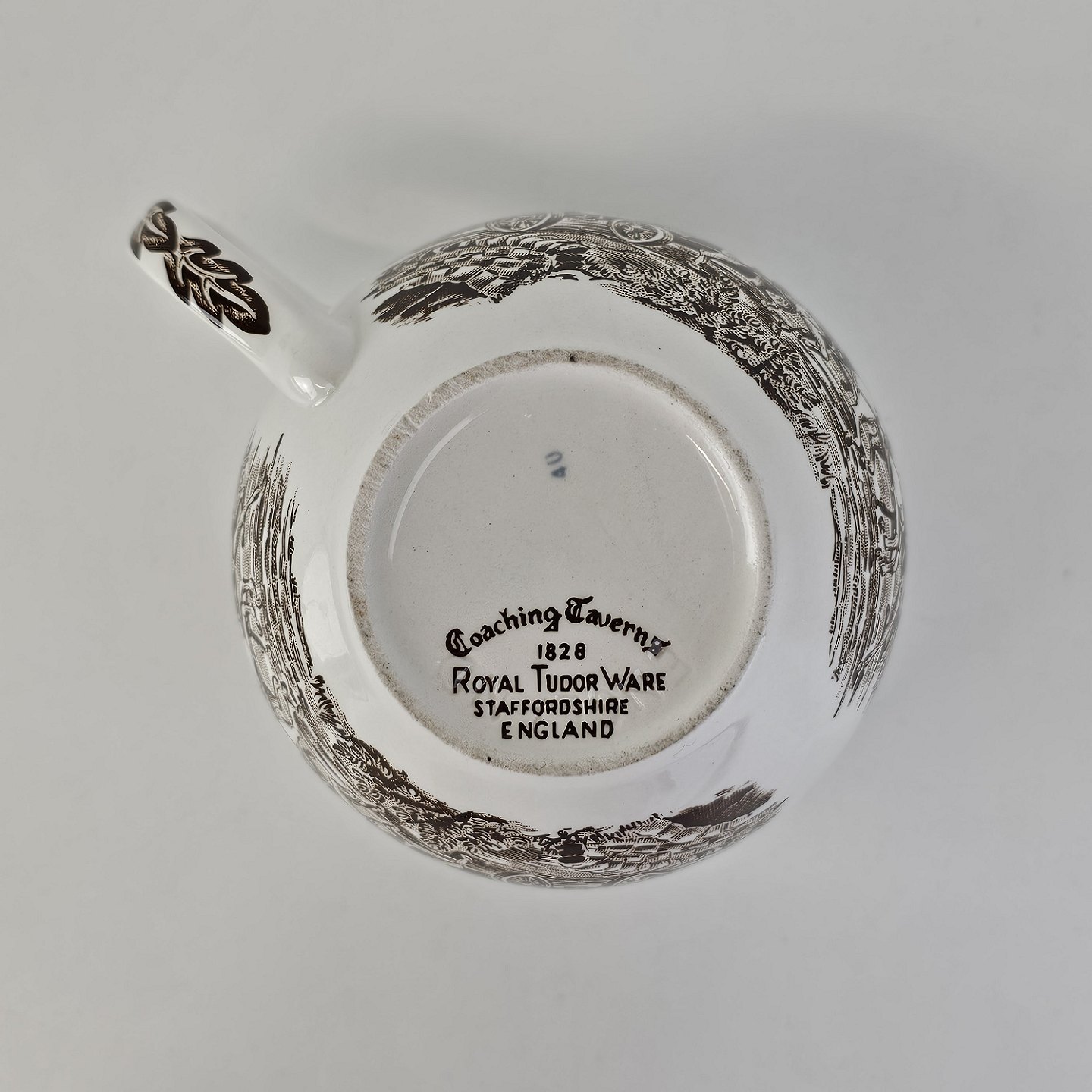 Beskrivelse: Stor kop og underkop i engelsk fajance fra stellet Coaching Taverns 1828