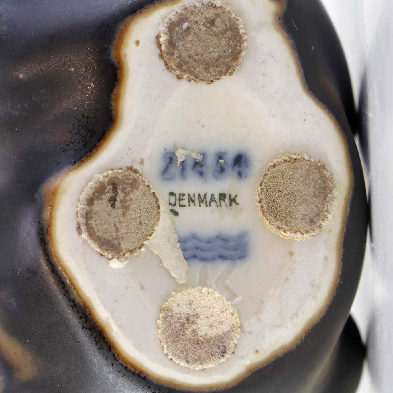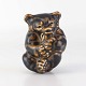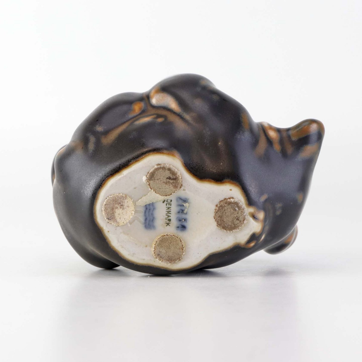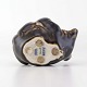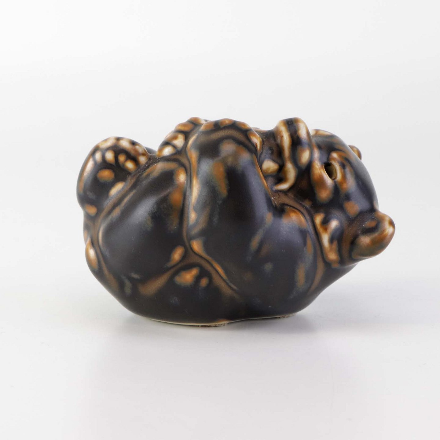 Beskrivelse: Figur i brunglaseret stentøj med motiv af liggende bjørneunge med pote i munden. Nr. 21434