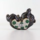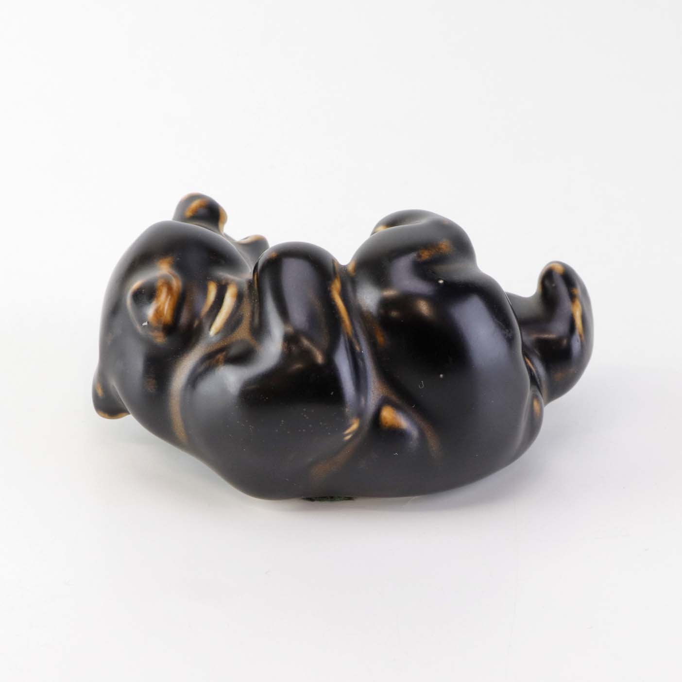 Beskrivelse: Figur i brunglaseret stentøj med motiv af liggende og legende bjørneunge. Nr. 21432