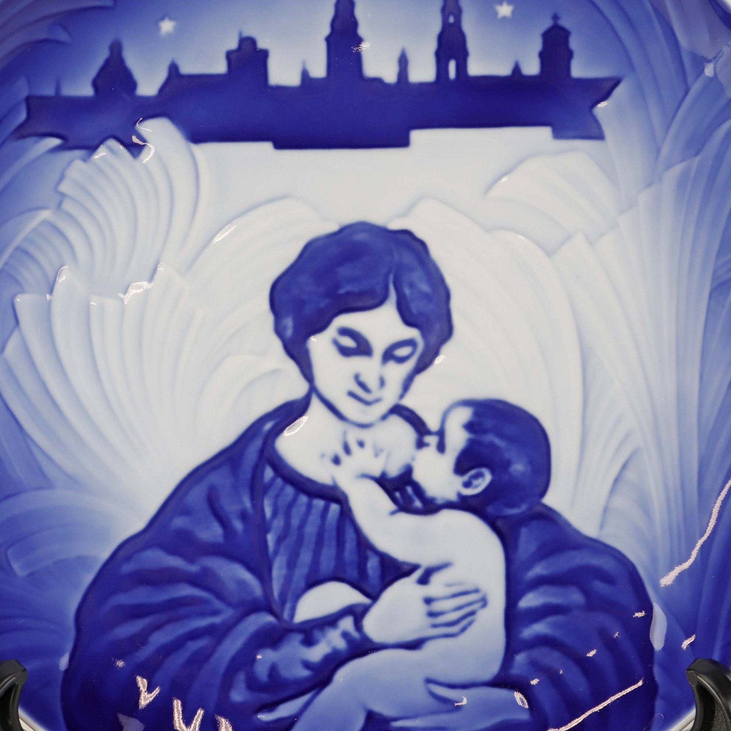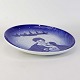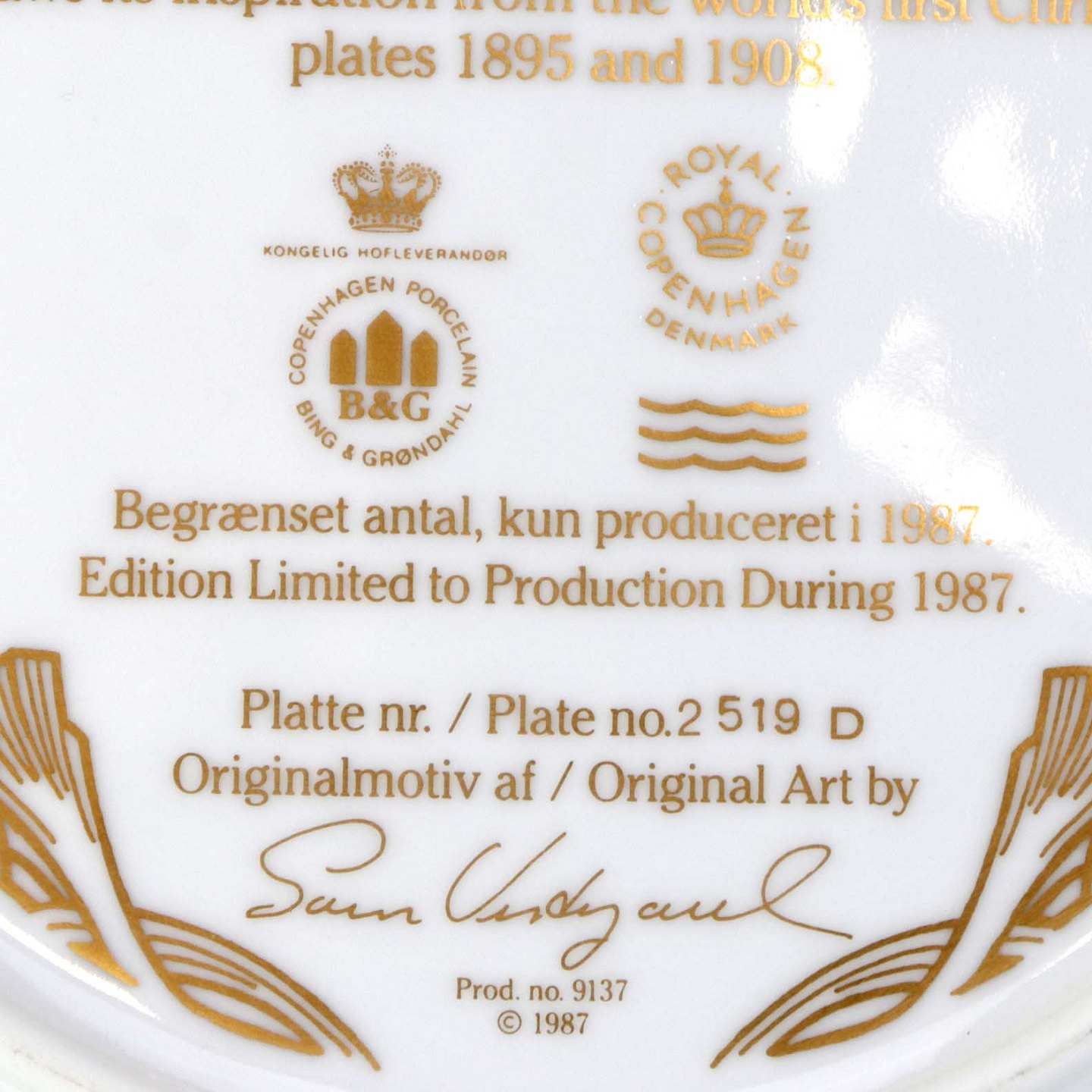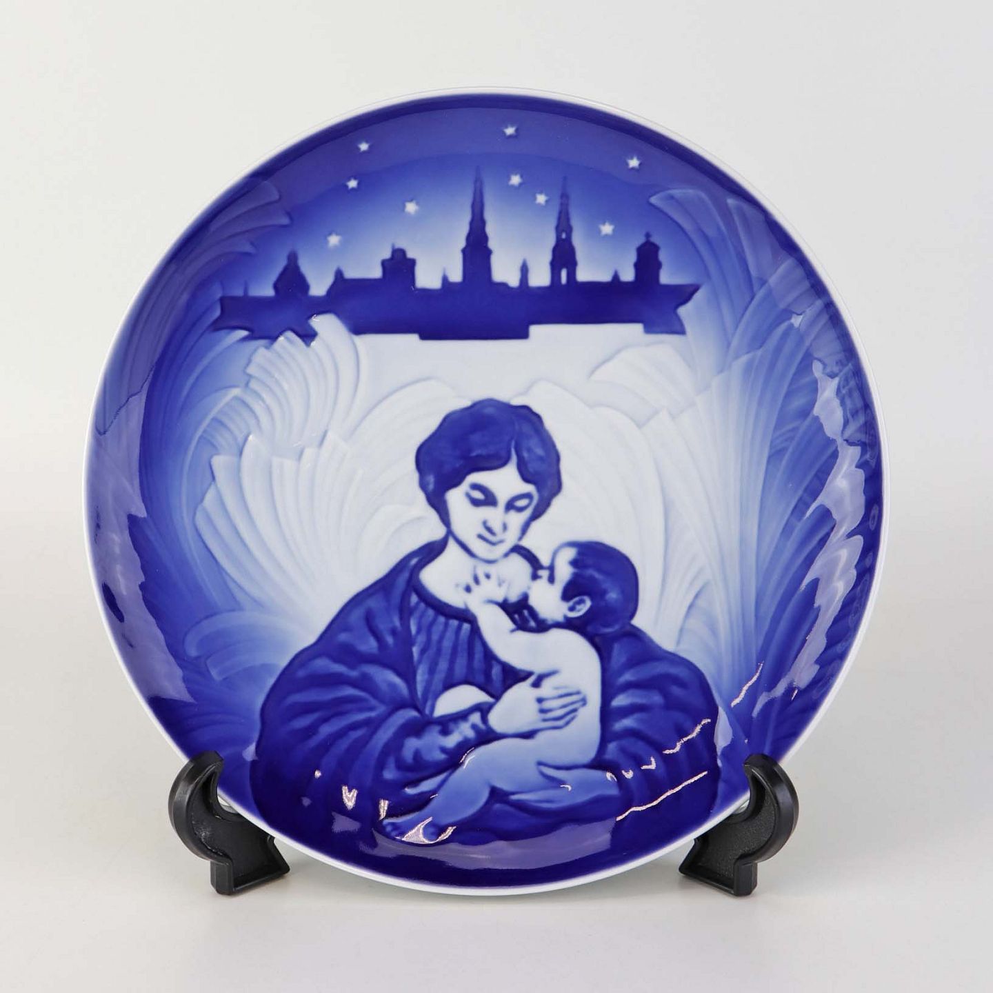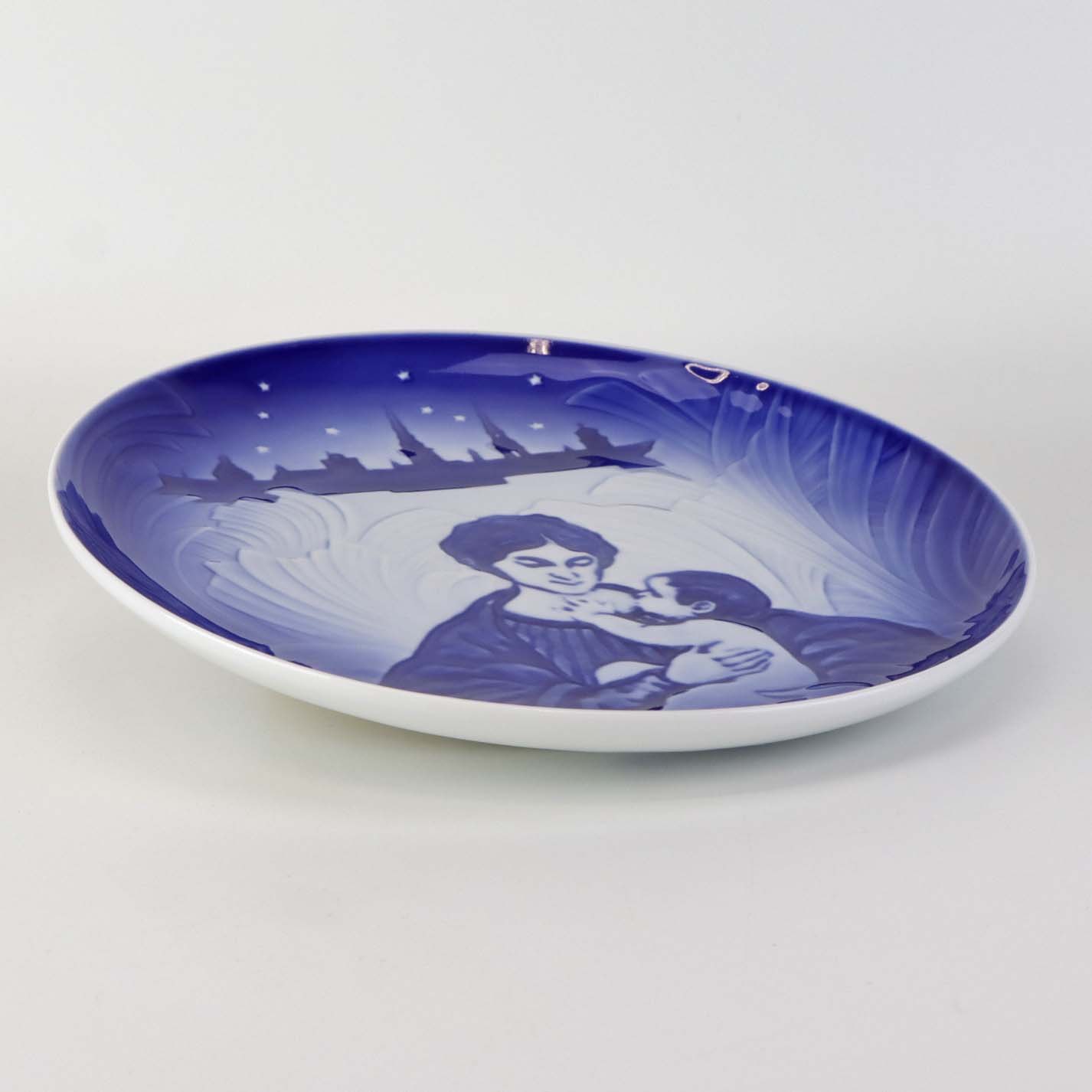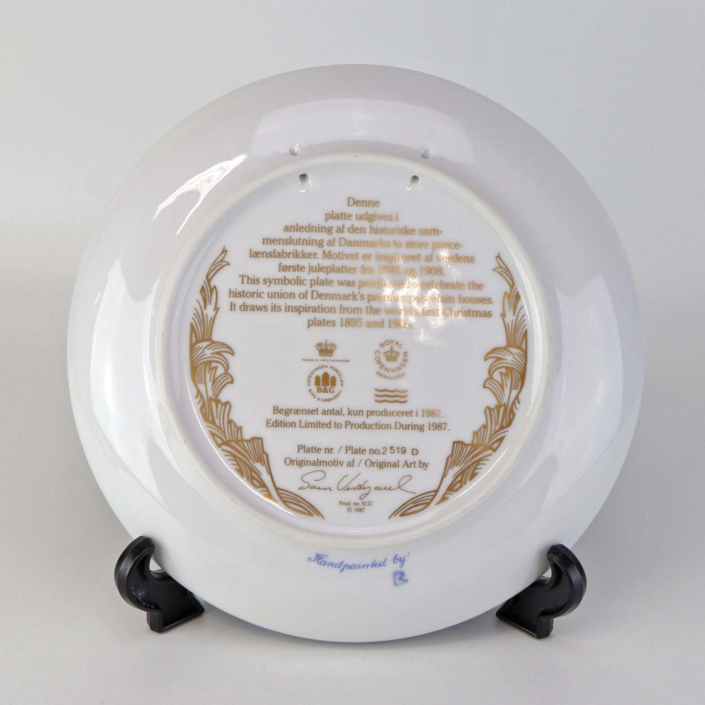 Beskrivelse: Håndmalet mindeplatte i porcelæn fra år 1987 i anledningen af sammenslutningen af Danmarks to store porcelænsfabrikker Bing & Grøndahl og Royal Copenhagen. Motivet er inspireret af juleplatten fra år 1895 og år 1908.