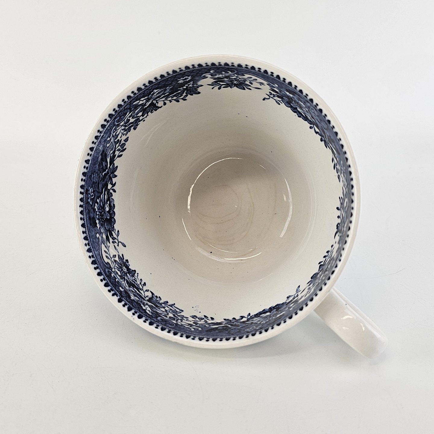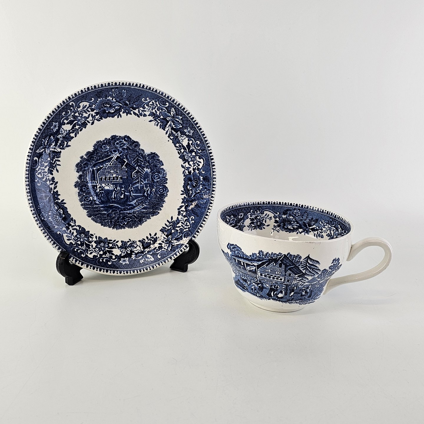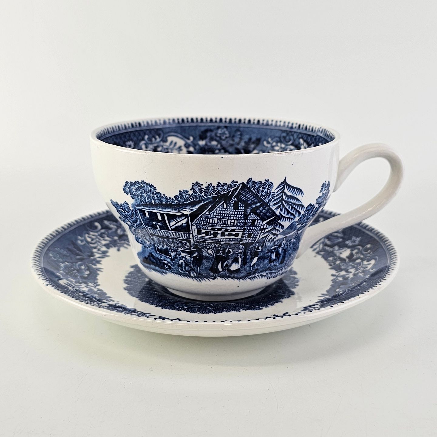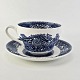 Beskrivelse: Blå kop og underkop i engelsk fajance fra stellet Avon Cottage