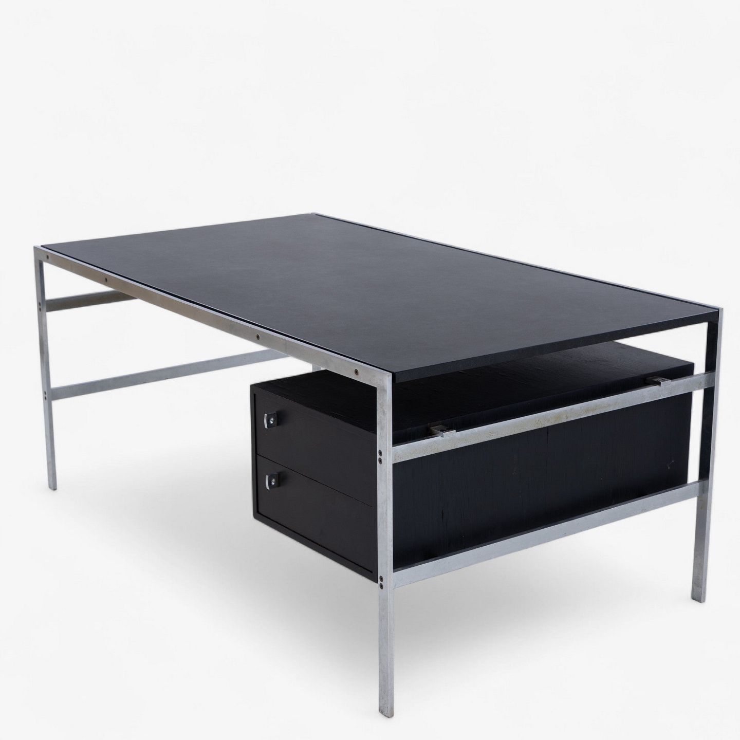 BO 550 - Skrivebord i stål med plade i 'Nero Assuloto'-granit med skuffemodul i sort wengé.