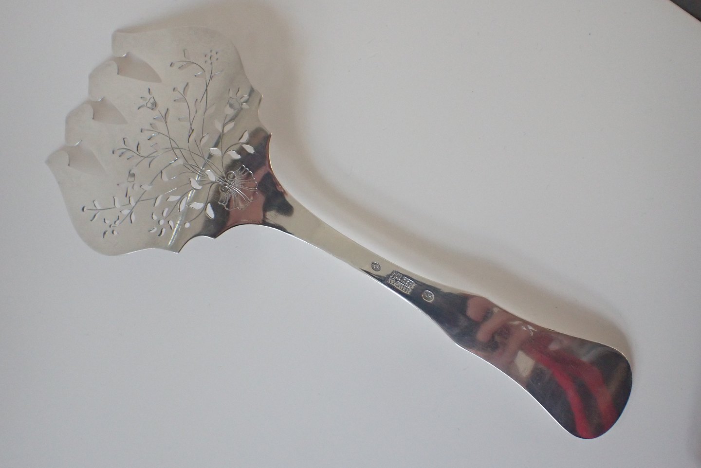 Beskrivelse: Holger Kyster (1898 - 1944) - fiskespade i 825 sølv med perforeret og påsat blomstermotiv. Stemplet Holger Kyster og 2 gange fuglen fra Kolding byvåben. Vægt 106 gram. Længde: 23,2 cm.