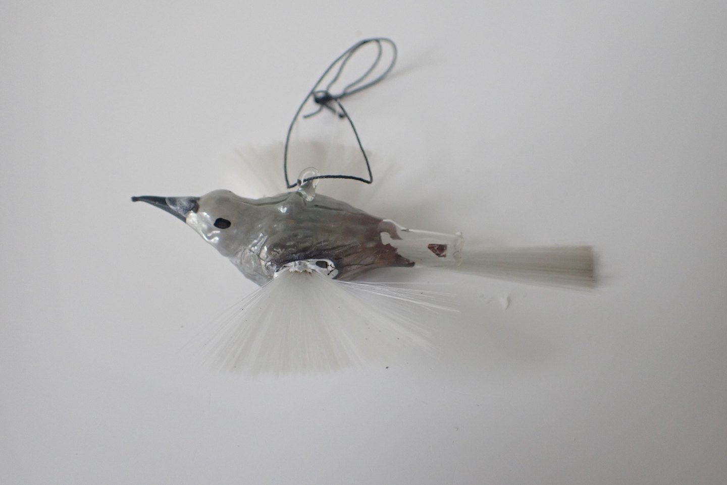 Næstøverst. Sjælden dobbeltvinget miniature fugl i anløben sølvfarve med hvide glasvinger og hale. Tysk ca. 1930. Længde med hale: 7 cm. I pæn stand i forhold til alder. r.