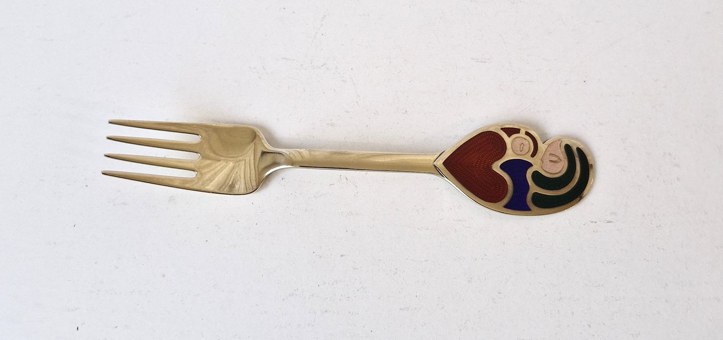 Beskrivelse: A.Michelsen julegaffel i forgyldt sterlingsølv med emalje 1968