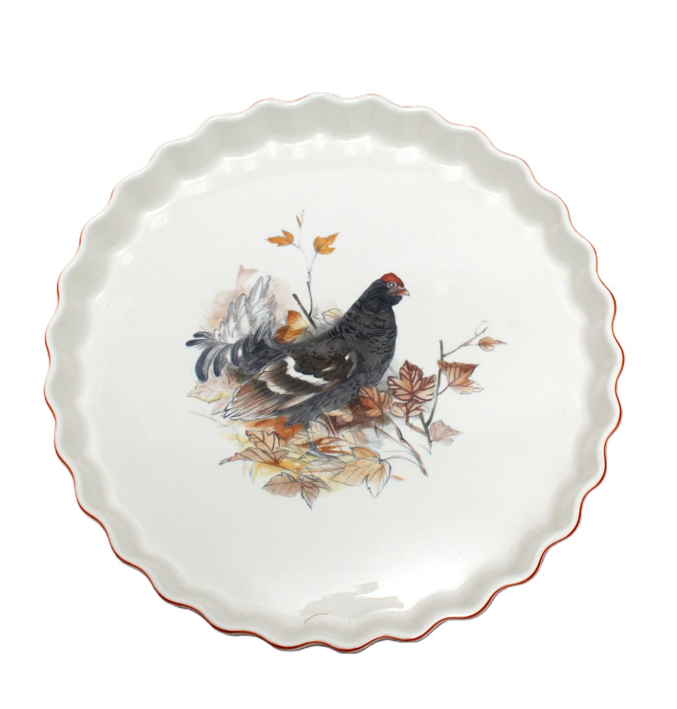 Beskrivelse: Villeroy & Boch, Jagtstellet designet af Mads Stage for Imerco. Stort Tærtefad med Urfugl. Fadet har en mere cremet farve end resten af Mads Stage stellet og er produceret af Villeroy & Boch. Fadet er ovnfast, tåler microovn og opvaskemaskine. Diameter 30 cm. Højde 4 cm. Flot ubrugt stand. Pris: 750 kr. Lager: 1